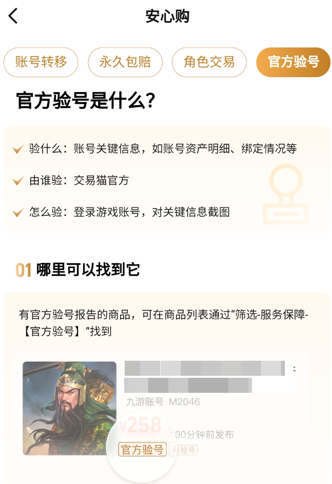 官方验号适用于一些高价值的商品,有些商品下面会带有“官方验号”的标识,而这些账号也就代表交易猫官方进行过检验,有专人上号去检查账号资源和提供信息是不是一致,账号是否存在封禁的情况,描述的装备是否存在限时问题,当账号确认没问题之后才会得到验号报告,所以在选择账号时,也可以考虑看看商品下面的标签。