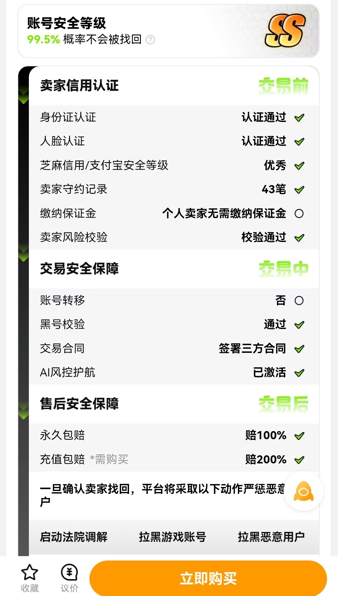 交易猫在安全方面已经走到了所有同类型软件的前列,上面链接可以由安卓用户直接下载APP到手机中使用交易猫,iOS手机用户目前只能搜索交易猫去官网交易。那么在安全方面有哪些优势,小编在下面将详细给大家介绍。首先是自身给所有成品号都覆盖了永久包赔,包赔比例分为30%和100%这两类。只要带有全额包赔的商品,在标签中都会有所展示。这样在交易成功之后,买家拿到账号进入游戏中正常去玩,出现了盗号,找回这样的情况,都可以向平台申诉,平台查清楚之后就会按照赔付比例直接进行赔偿。