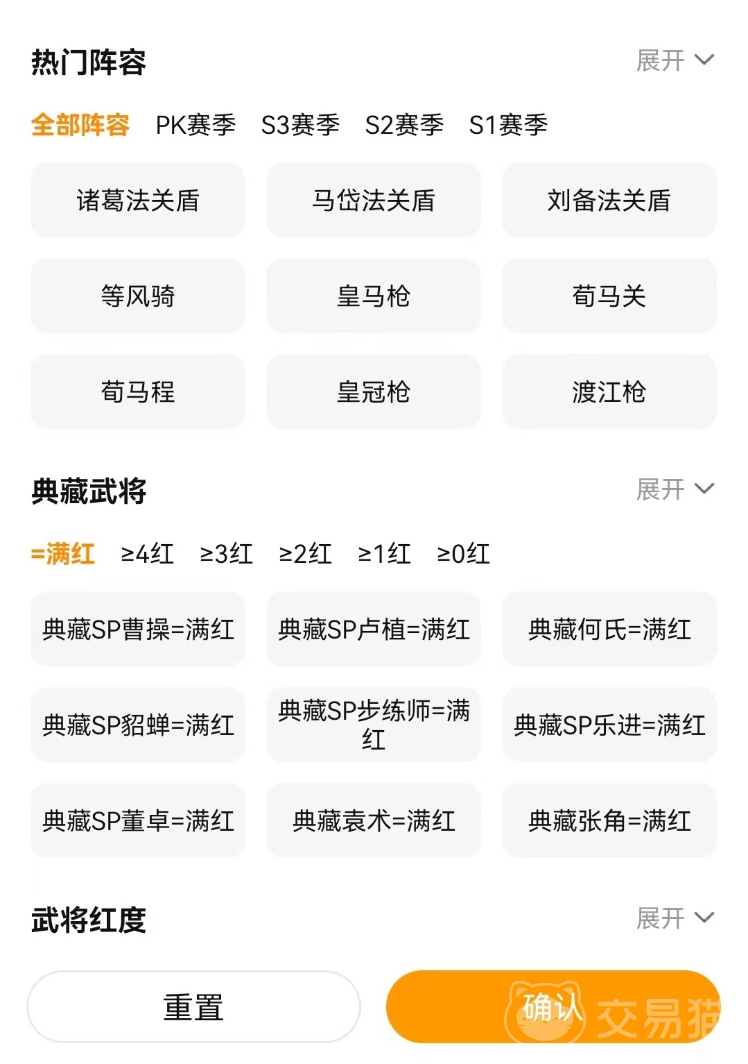 大家只需要搜索到三国志战略版的专区,在筛选中直接点击账号转移,这样选择出来了就是所有可以进行账号转移到商品。从中途还可以再进行更为细致的筛选。例如账号中拥有哪些热门阵容,拥有哪些典藏武将,以及武将红度和装备特技,武将皮肤等,都可以直接筛选出来。利用这些功能就可以快速锁定最适合自己的账号,不需要再到处寻找了。