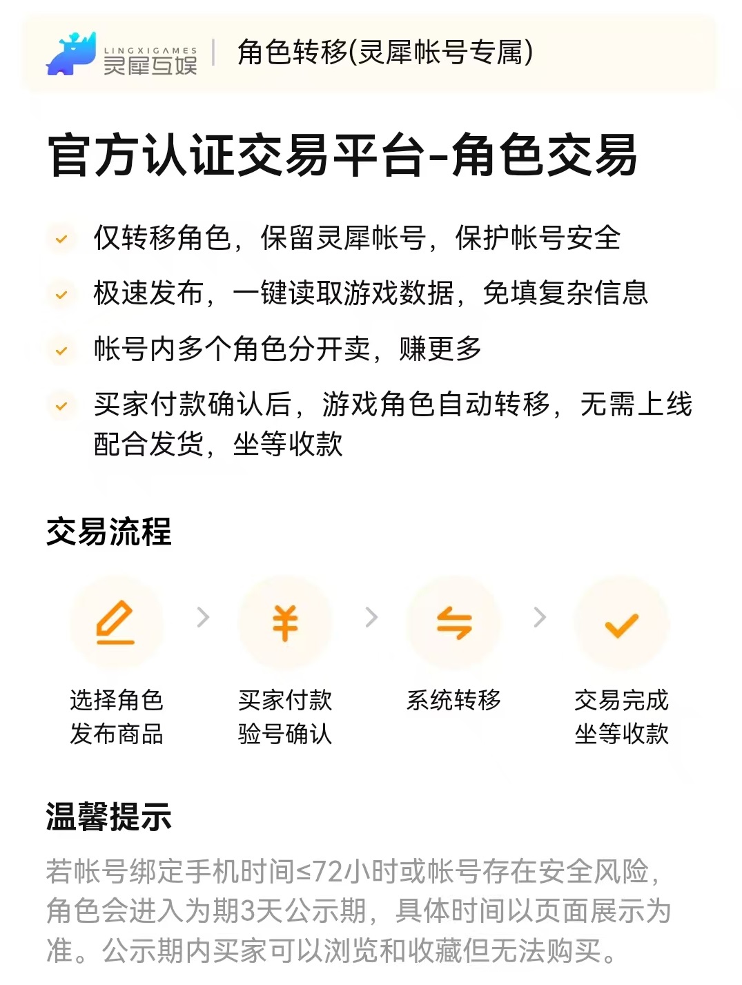 角色交易是官方认证的交易平台,特点是仅转移角色,可保留灵犀账号,这样不仅能够保证账号安全,还能做到账号内的多个角色分开去卖,这样赚的更多。还具有极速发布的优势,一键直接读取游戏数据,不需要再填其他的复杂信息。当买家付款确认后,游戏中的角色将自动进行转移,这样不需要再上线配合发货,坐等收款就可以了。这样对交易双方来说都是非常便利的一项服务,出售者可以快速卖出去并且只卖自己不需要的角色,而保留需要的角色。买家可以快速拿到自己理想的角色,购买起来也更加自由。