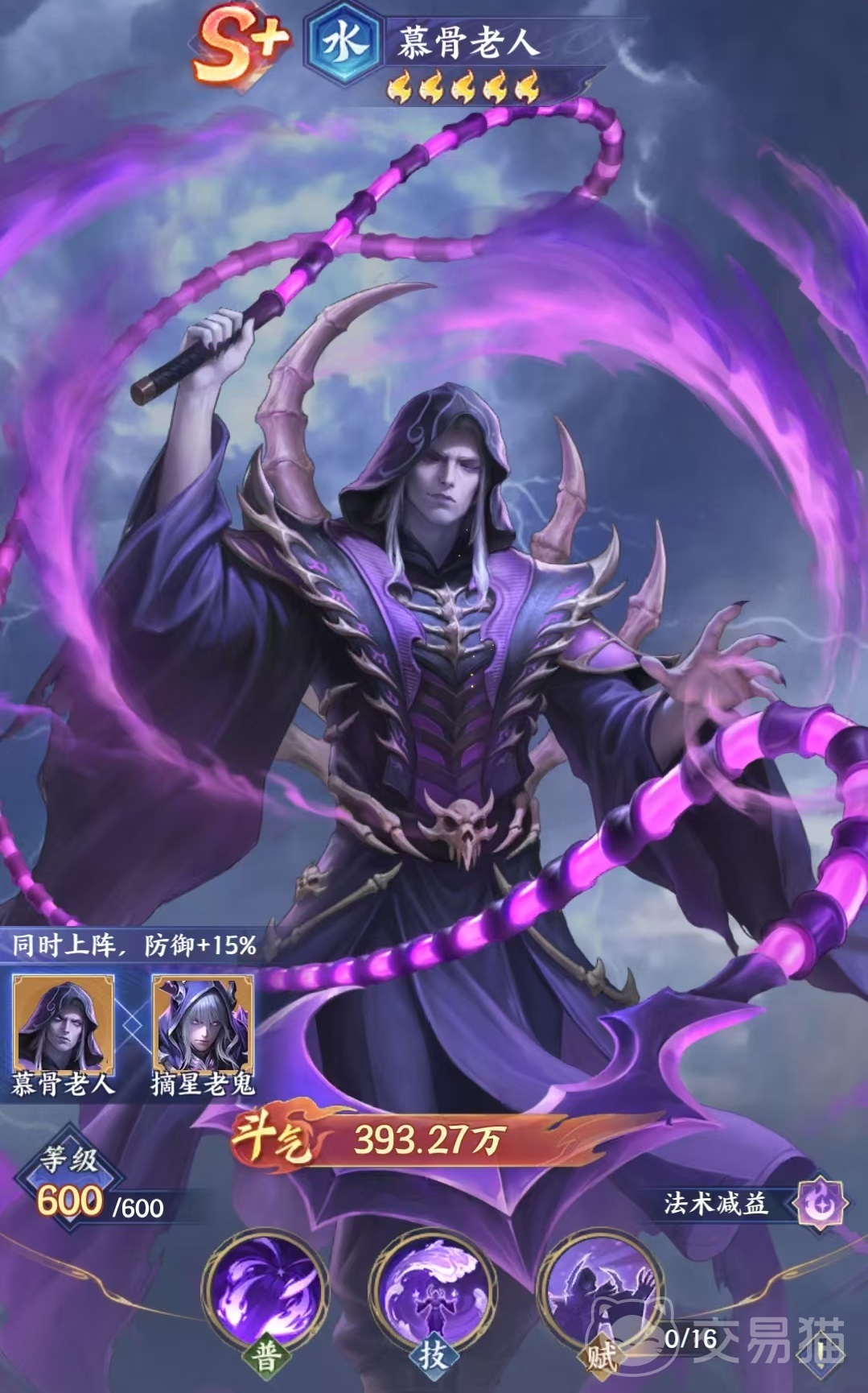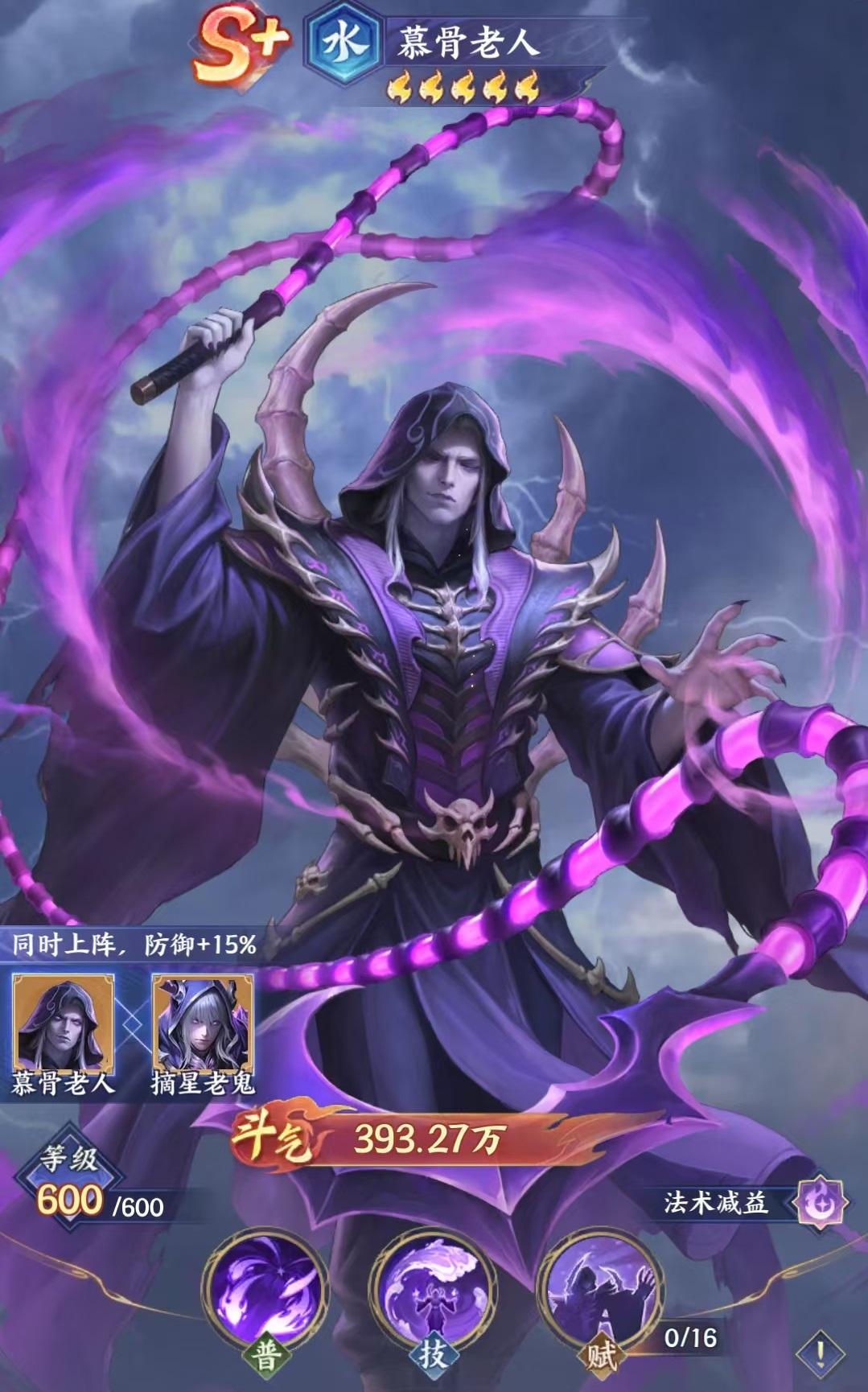 今天为大家深度解析《斗破苍穹》手游中极具战略价值的水系S+级斗者——摘星老鬼。该角色虽在原著中以诡谲莫测著称,在游戏中则被精准定位为高阶法术控制型核心,其机制设计兼顾群体压制与怒气干扰,是中后期阵容构建的关键支点。