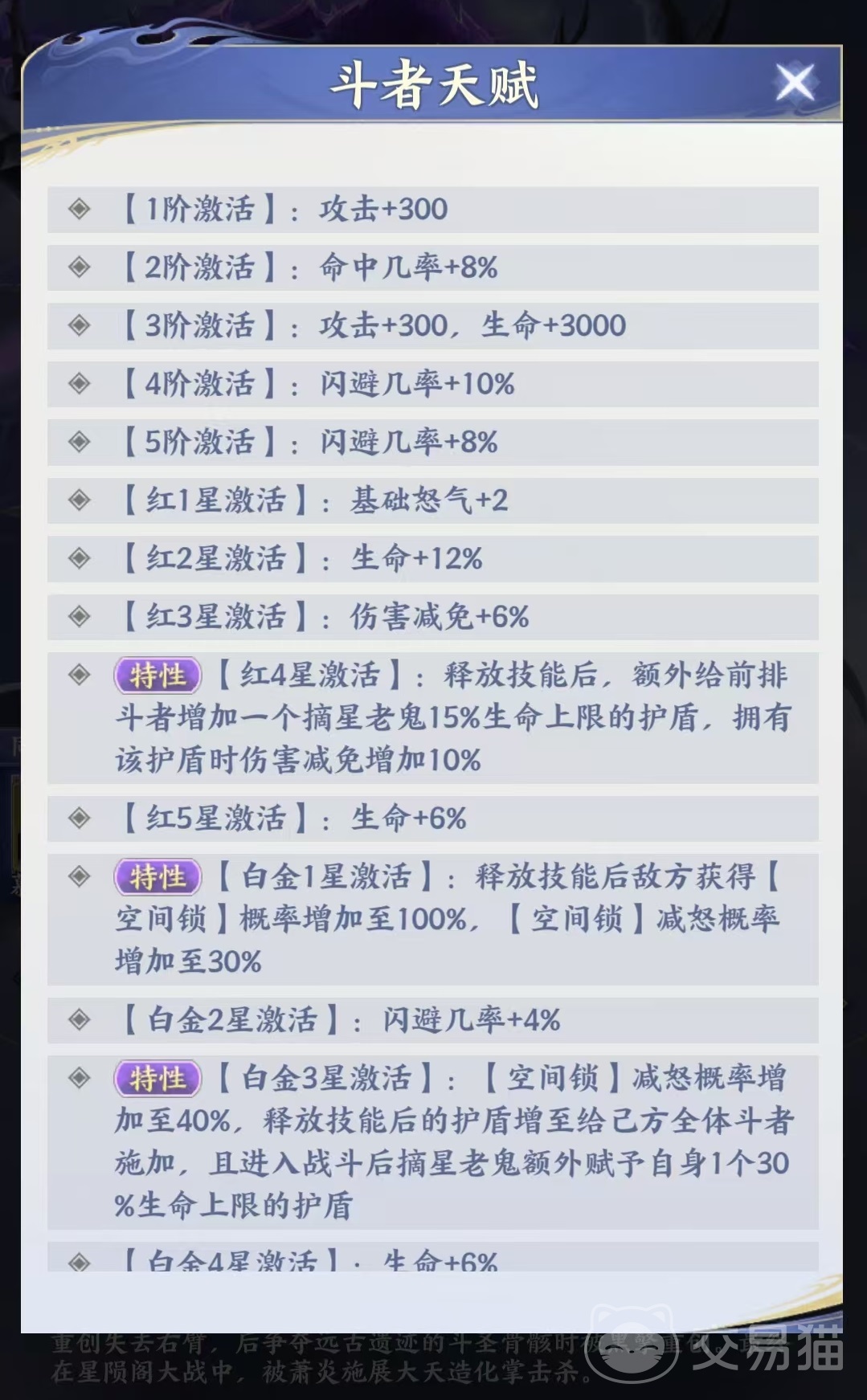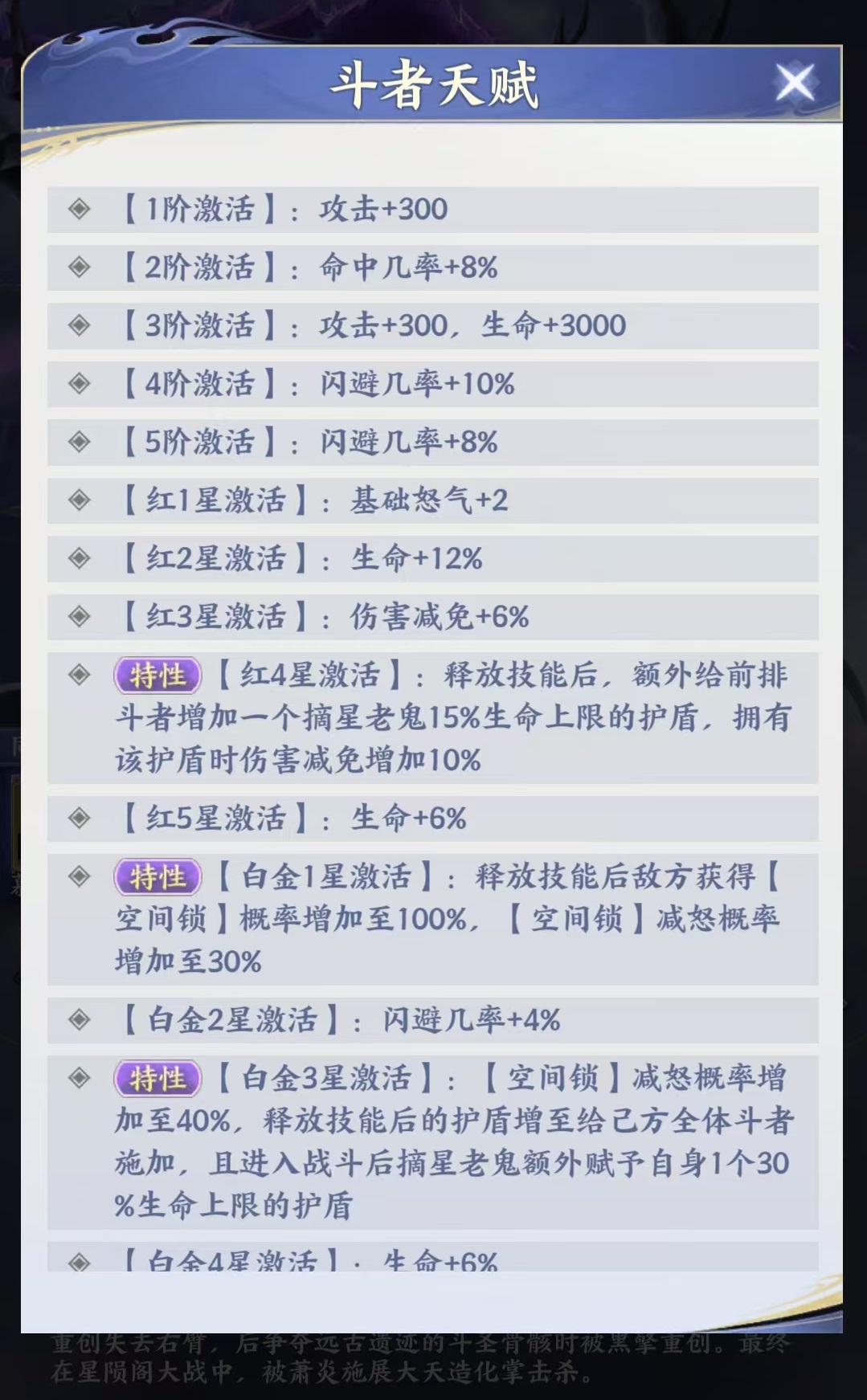 角色成长路径高度依赖星级突破:红四星解锁首层战术价值——释放技能时,为前排斗者附加护盾,提供稳定伤害减免;白金一星起,空间锁触发率提升至100%,且减怒概率同步增强;白金三星进一步扩展护盾覆盖范围至己方全体,并赋予摘星老鬼开局即享的初始护盾;粉彩一星新增反制机制:当其施加的护盾被敌方击破时,有概率触发目标眩晕效果。由此可见,该角色并非前期即战力,而是典型的养成向控制核心,越到高星阶段,对战局的掌控力越强。