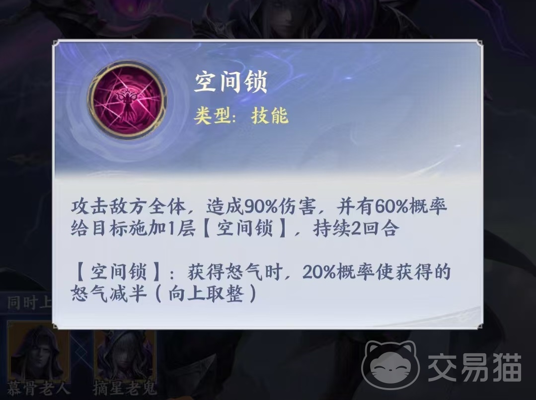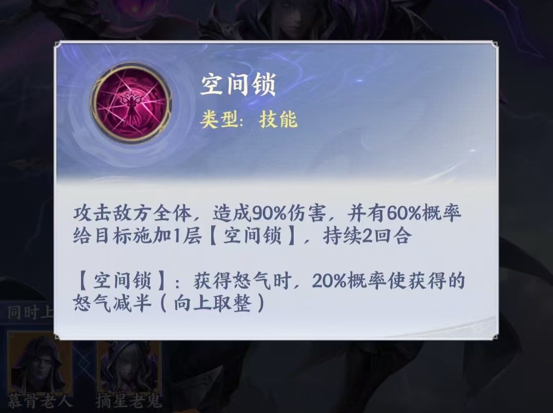 摘星老鬼拥有专属属性“水”,战力评级为当前版本最高档位S+。其协同机制明确:与慕骨老人共同登场时,全队可获得15%额外防御加成。核心技能“空间锁”为全体攻击技,命中后必施加一层持续两回合的空间锁状态;该状态生效期间,敌方每次获取怒气均有概率减半——此为打断节奏、延缓大招释放的核心限制逻辑。