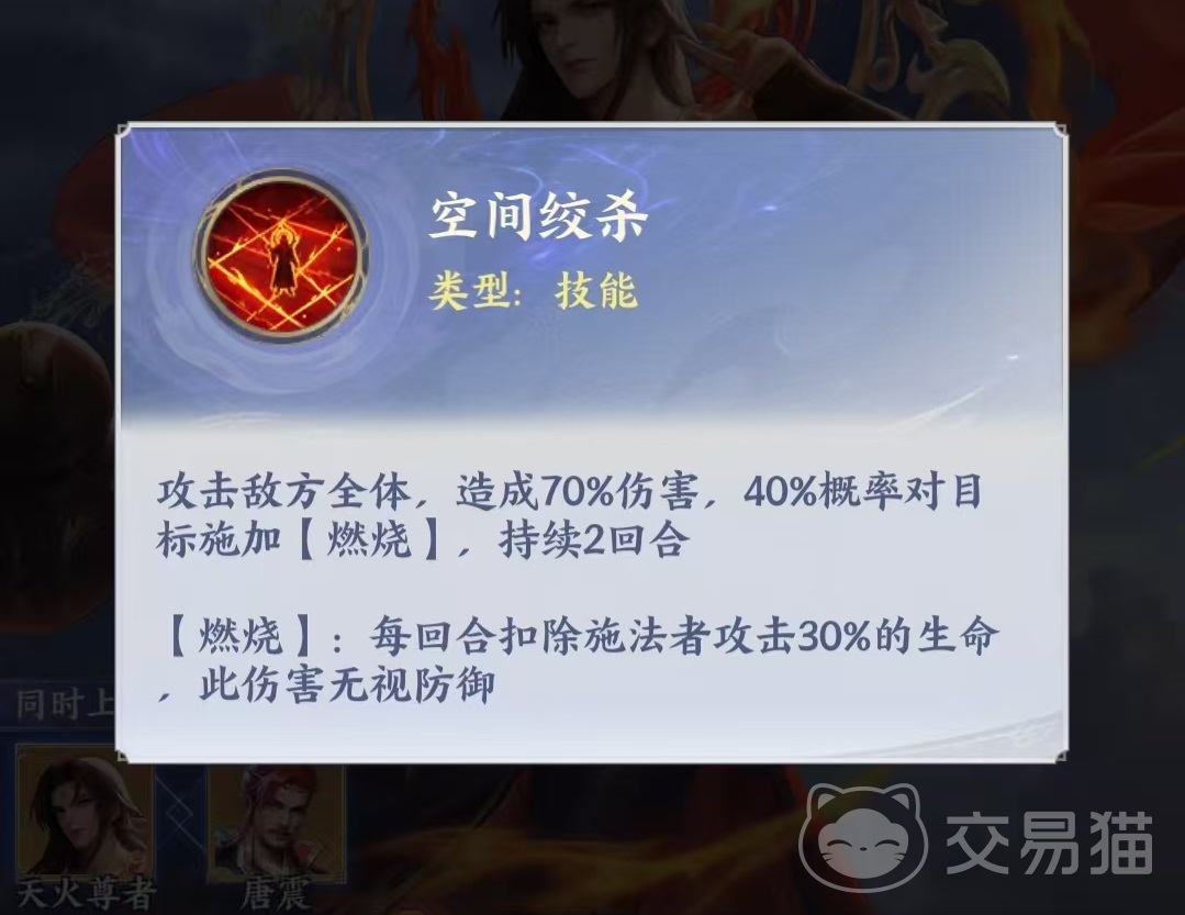 天火尊者拥有专属火属性加成,并与唐震存在固定羁绊:两人同时上阵时,全队获得15%基础攻击力提升。其普攻并非单体锁定,而是覆盖敌方前排全体单位,在分散伤害的同时显著提升AOE总伤效率。该设计使其在面对多前排布阵时具备天然压制优势。