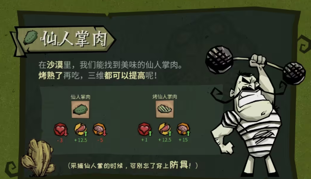 沙漠生态区特有的仙人掌肉,采集需装备皮甲或更高级防具(否则每次采集承受2点伤害)。生品具有-5点生命值修正,不可直接食用;经烘烤处理后,可稳定恢复40点生命值并提供10点耐力值加成,是干旱地形下续航能力的核心补给来源。