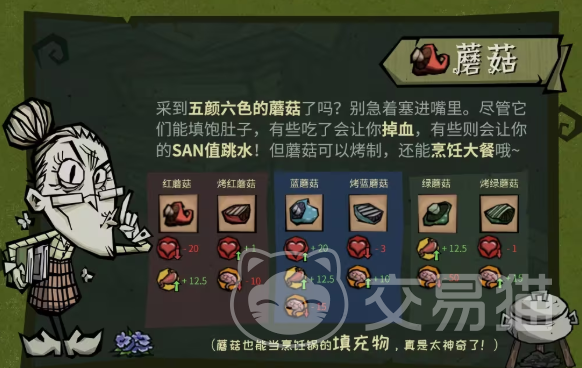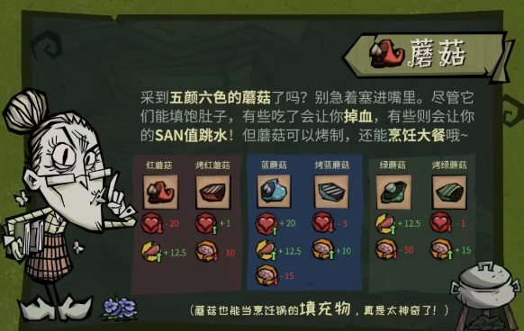 彩色蘑菇按颜色区分具有明确毒性机制:红色蘑菇生食导致每秒损失3点生命值,持续15秒;蓝色蘑菇引发精神值衰减,使角色视野模糊并降低移动速度;黄色蘑菇则造成双重负面效果。所有彩色蘑菇经充分烘烤(≥8秒)后毒性完全消除,转化为可恢复30点生命值的安全食物,是中后期高风险区域的重要生存保障。
