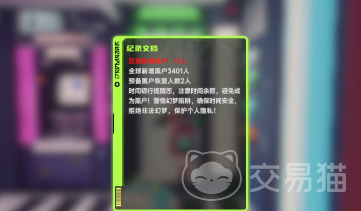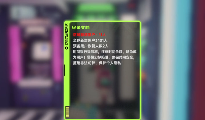 游戏内唯一通用货币为“时间”,单位为“秒”或“分钟”,直接映射角色剩余生命时长。这一设定并非象征性设计,而是驱动全部玩法的底层规则:所有收入来源——包括股票交易、调酒服务、数据掮客任务、义体维修等——产出的均为可消耗的时间值。当时间归零,角色将被系统标记为“失效个体”,档案清除、网络接入权限永久终止,游戏进程强制终结。因此,时间管理是贯穿始终的第一生存法则。