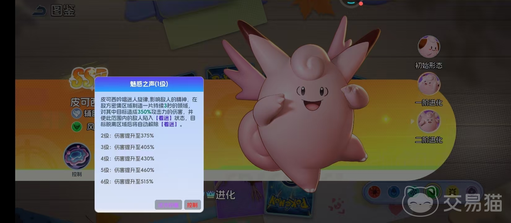 最终形态皮可西拥有粉色双翼,是风系辅助体系的完全体。核心技能“魅惑之声”为其标志性机制:释放后在敌方密集区域生成持续3秒的领域效果,对范围内目标造成高额伤害,并使其陷入“着迷”状态——该状态下单位将强制停止所有行动。一旦目标脱离领域范围,“着迷”效果立即解除,确保控制精准可控,大幅提升团战节奏调度能力与集火效率。