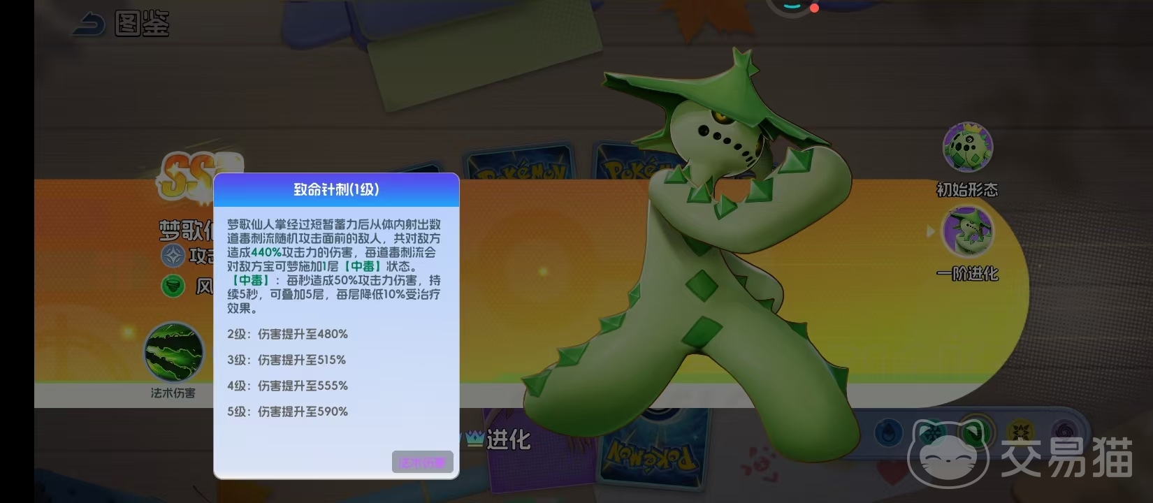 完成一阶进化后,形态升级为梦歌仙人掌。风属性不变,但战术重心转向多段毒素叠加与持续伤害转化。主力技能“致命针刺”具备短前摇蓄力特征,释放后向正前方发射多道毒刺流,合计造成590%攻击力的单体伤害;每道毒刺命中目标后均独立触发中毒状态,该状态持续生效期间,每秒造成相当于施放者50%攻击力的真实伤害。