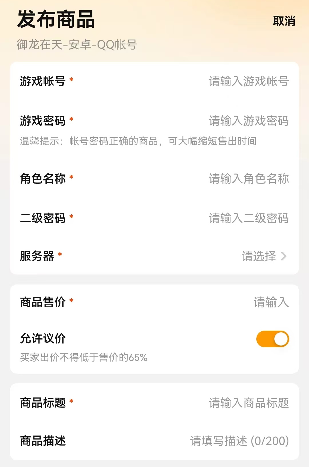 如果想要出售号,就直接点击卖账号,同样选择御龙在天。发布的时候也是按照模板去填写,包括自己角色等级,所具有战斗力和职业等,只要只需要简单几步就能直接完成商品发布。一定要明确好自己在线时间,这样方便接下来买家来进行价格商讨。