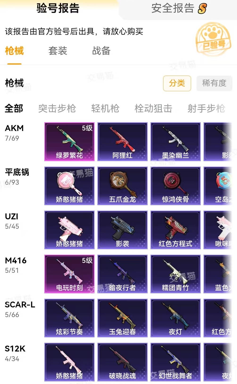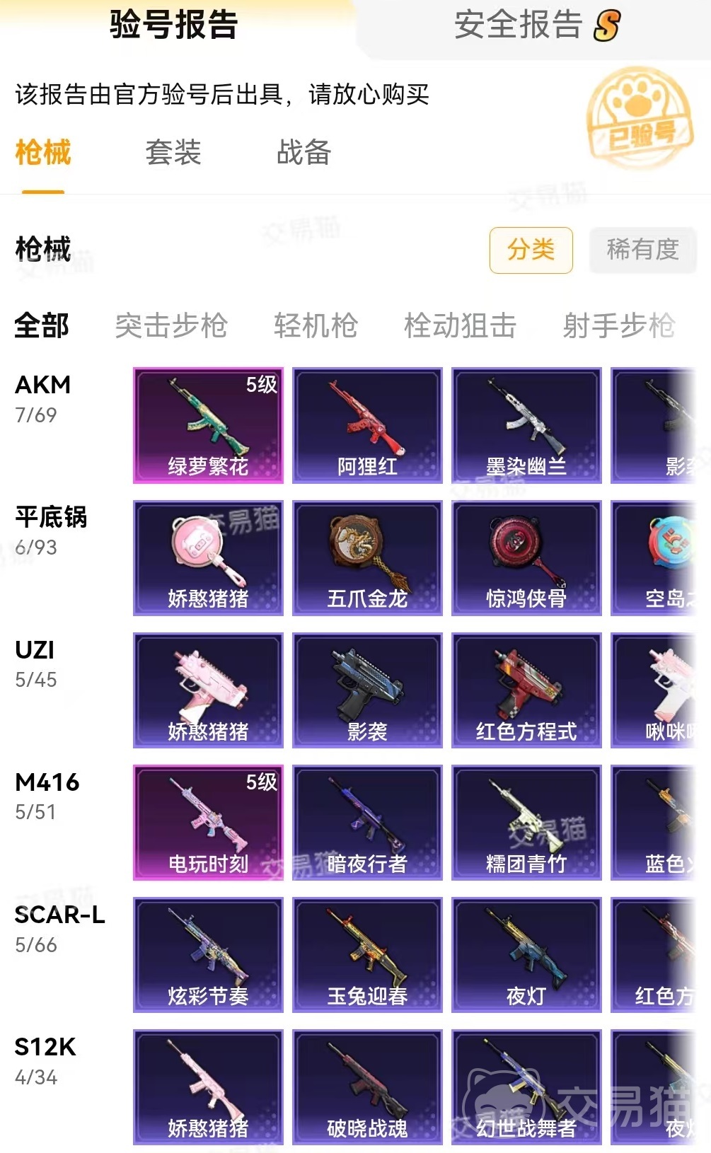 至于大家看到的内容是否是真正情况,这一点完全不用担心,因为有官方提供的验号报告。由官方人员登录账号,进行实地检验后截图出来生成报告。里面拥有哪些枪械哪些套装等,都会清楚的展现出来。验号报告中带有交易猫水印绝对不会出错。在发货时候直接进行在线解绑和重新绑定,拿到手之后就不用担心各种问题。