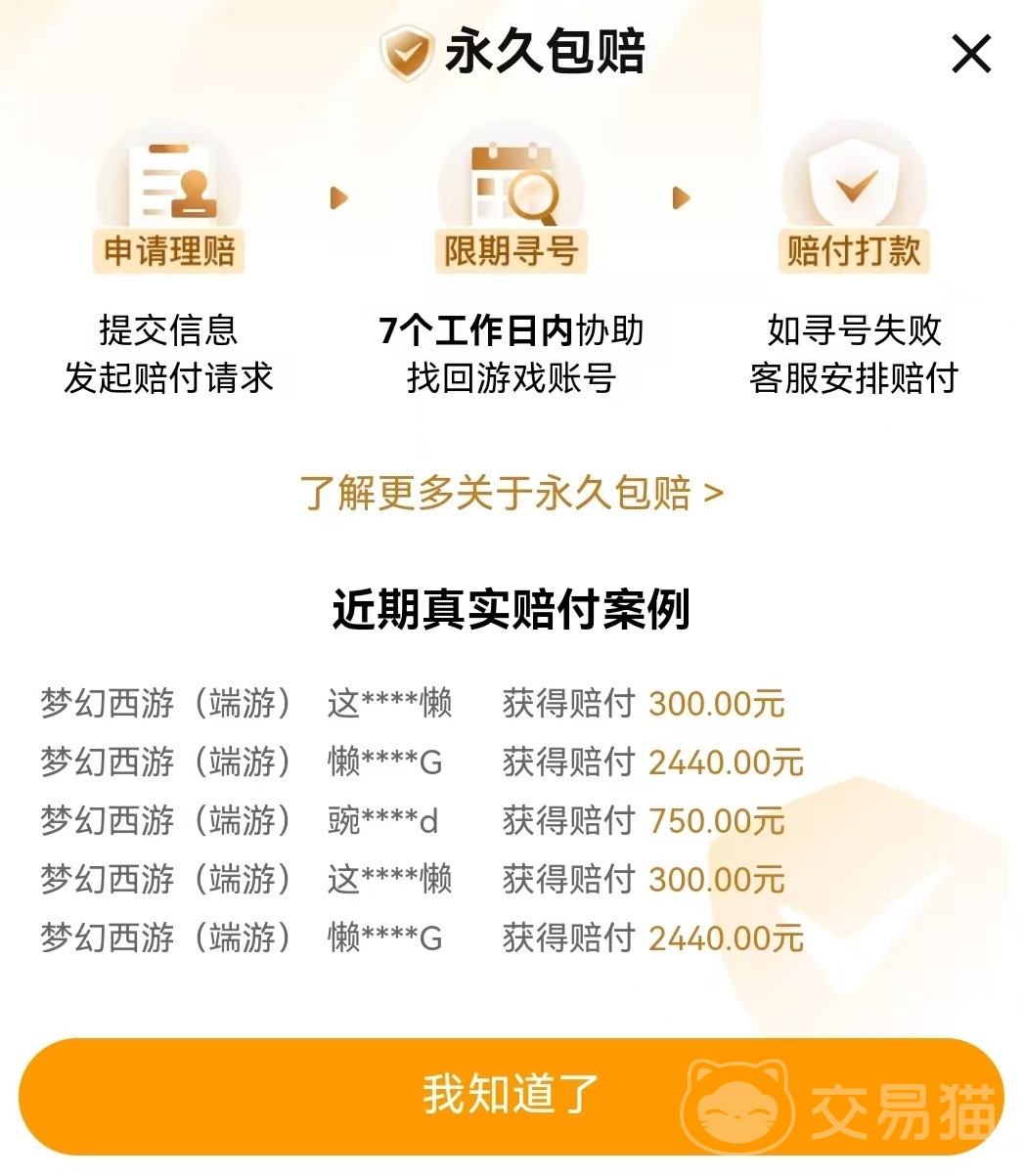 交易猫中的所有成品号都覆盖了永久包赔,在比例方面有所区别,有些是全额包赔,有些只有30%的额度。不过不用担心,购买时30%额度也可以自己直接升为全额包赔,这样一旦出现被盗号被找回,就由平台来进行赔偿。交易猫在安全方面还体现在自身推出了官方验号环节,账号检验在买卖过程中本来就是重中之重。由专业人员进入其中进行检验,将真实情况截图展示出来,这样就不会出现那些通过虚假宣传来吸引关注的卖家了。无论是全额永久包赔还是官方验号,只要带有这些标签,都可以在筛选中直接找出来,推荐选择这些商品购买,可以节省很多麻烦。