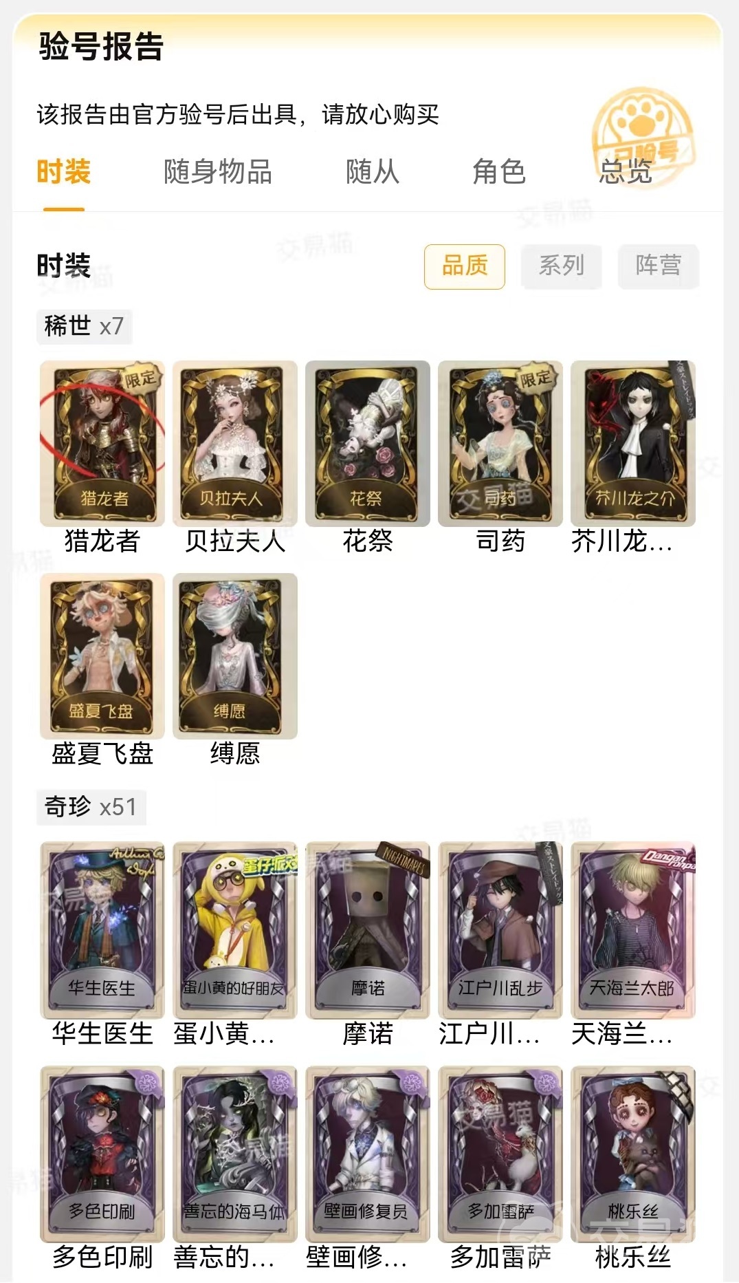 看完上面的介绍之后,大家现在就清楚第五人格买号去哪里好了吧,无论哪一款游戏,只要大家想买号就来交易猫中进行操作,价格高低所享受的服务和保障都是一样的,可以放心在这里进行挑选。