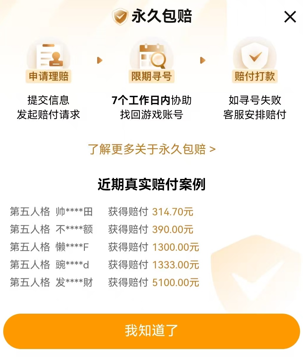 在交易猫中出售的成品号都覆盖了永久包赔,但是有着两种不同的额度,分别是30%赔偿和全额赔偿。用户可以在筛选功能中直接对这些账号进行筛选,30%的赔偿额度也可以在购买时候自己升级成全额赔偿。这样在拿到手之后,如果再出现被盗号被找回这样的情况,就会由平台来进行赔付。如果进行交易的是一些金额比较高的号,一定要重视此项措施。官方验号指的是账号检验过程都是专业交易人员来进行操作,里面截图也都是真实情况,只能够看到最准确消息介绍,所以不用担心虚假宣传问题。