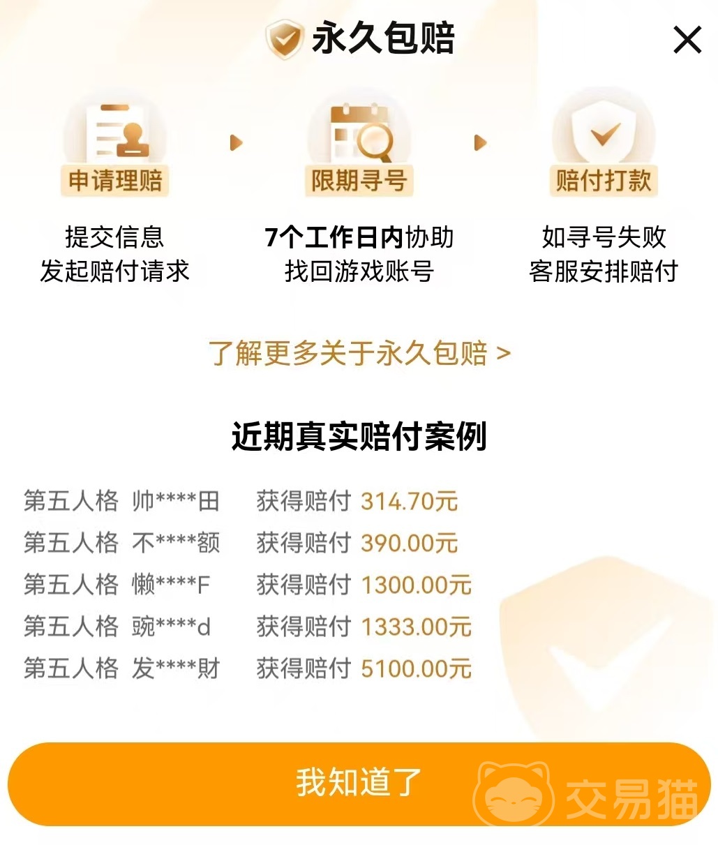第五人格这款非对称竞技游戏现在依然拥有很高的热度,互相追逐竞技的玩法吸引了众多玩家关注,最近有很多小伙伴们想要入坑,所以都在问第五人格买号去哪里好 。确实现在购买游戏号是好选择,交易猫就是目前最安全的游戏交易平台,作为阿里巴巴灵犀互娱旗下平台,安全自然有保障,还是业内唯一一个做到了全场送永久包赔。
