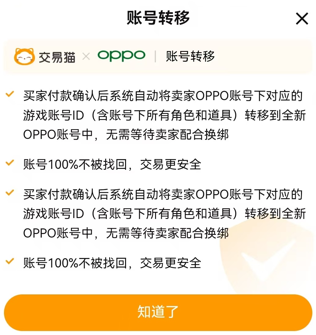 每个商家都会展现出自身的芝麻信用情况以及进行认证的情况,买家可以选择那些信用良好的进行交易,也可以减少问题发生的几率。针对九游等少数几个平台,交易猫还推出了账号转移服务,直接将号里面的各种资料转移到买家号中,彻底杜绝了各种问题发生,这项服务覆盖的范围也在不断扩展,是现在最安全的交易方式。