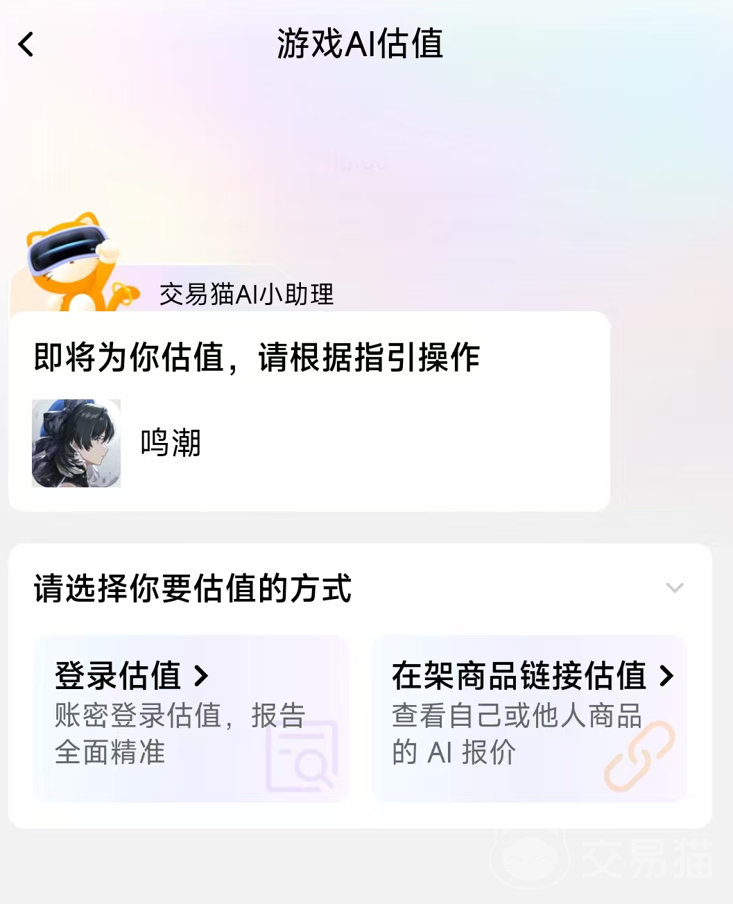 大多数的鸣潮玩家可能对于账号的价值是不清楚的,导致随意定价让账号出售变得十分困难,而想要解决这类问题的话可以找到交易猫平台,该平台拥有一个强大的估算功能,这个功能是有专业的ai分析,提供账号内的价值物品,就能获得一个价格的评估,后续放到交易猫平台出售就能很快进行出售哦,而且交易猫是阿里巴巴灵犀互娱旗下平台,背靠阿里官方背书,交易安全更有保障,还是业内唯一全场赠送永久包赔的平台,同时交易猫平台使用方式便捷,安卓用户点击页面上方指定按钮即可下载,iOS用户直接访问交易猫官网就能使用。