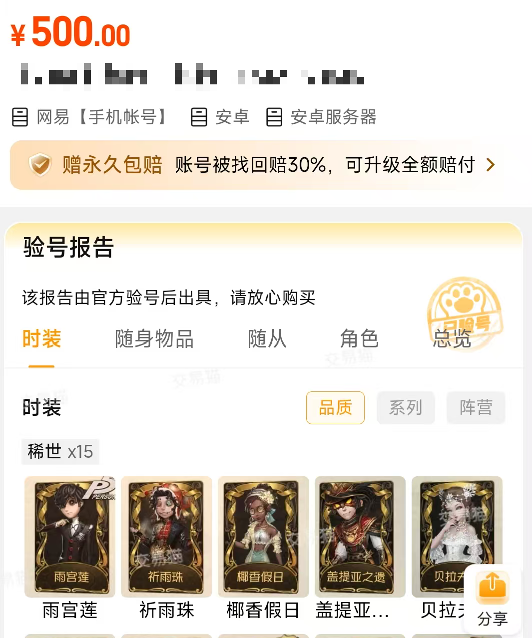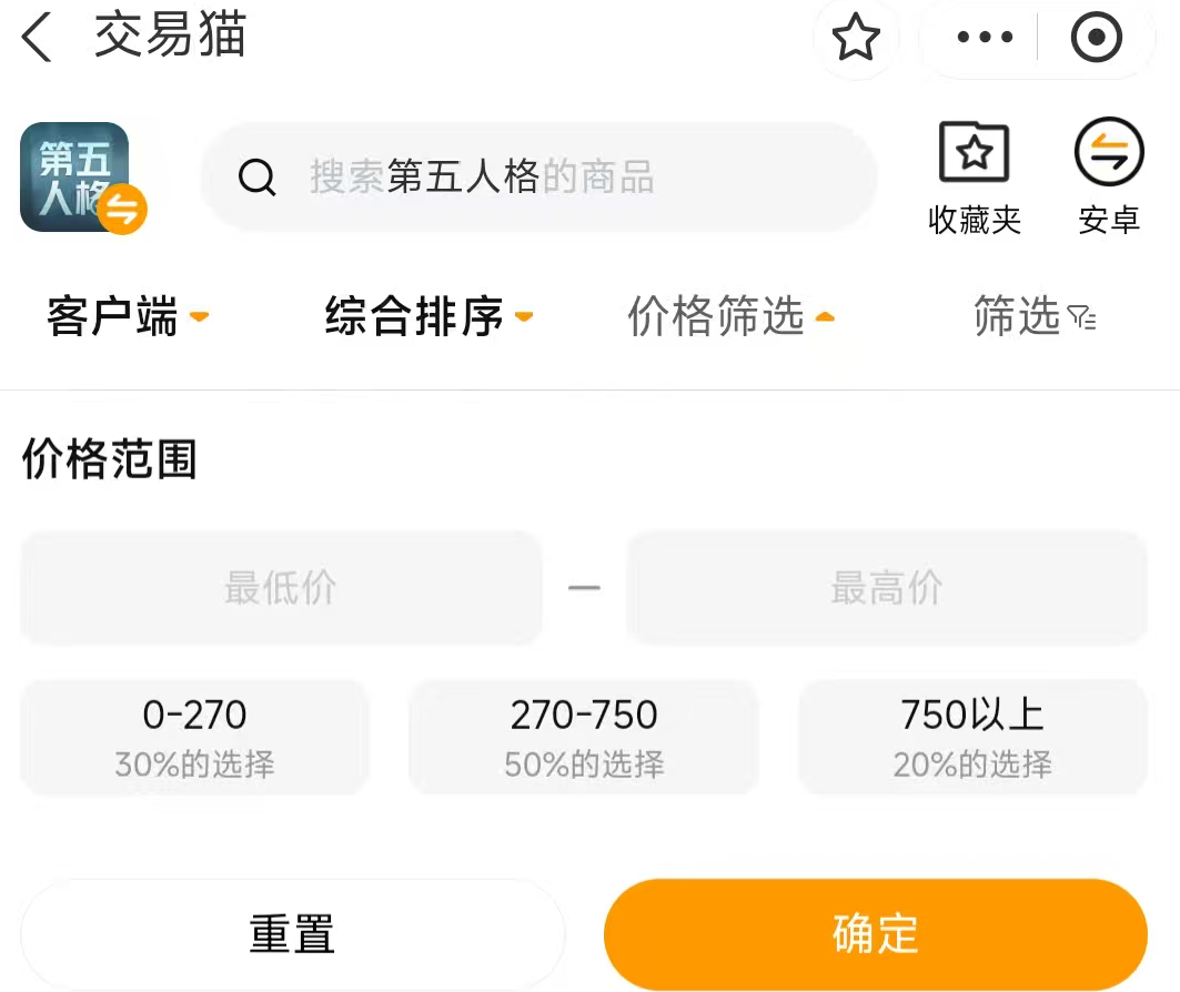 以上就是第五人格账号交易平台有哪些的全部信息了,第五人格账号整体还是比较贵的,如果用户们想要购买以后想要获得一个安心的体验,还得是交易猫平台靠谱,几乎每一项服务都有保障哦!