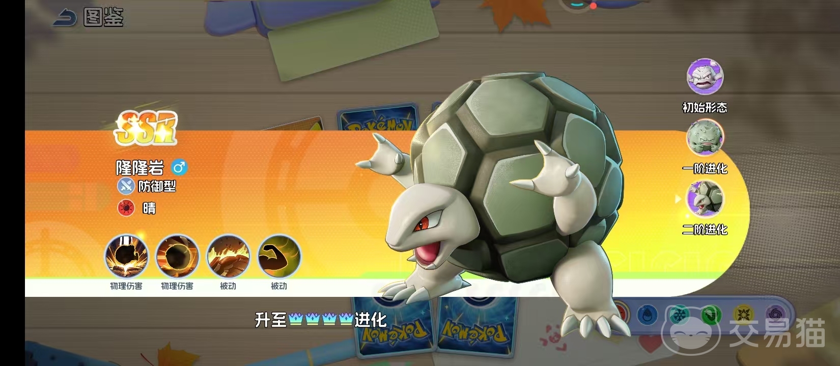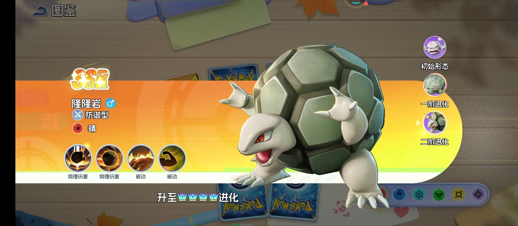 最终进化形态为隆隆岩,全身覆盖致密结晶化岩甲,防御属性达全系前列水平。除继承并强化前两阶的抗性机制外,新增岩石系专属主动技能“大地震颤”,具备高倍率群体伤害与短时减速效果;同时解锁“岩铠”状态,在特定条件下可减免下一次高额伤害。从初生岩块到终极岩王,该进化线完整呈现了低成长起点宝可梦通过阶梯式强化实现战术维度跃迁的过程。