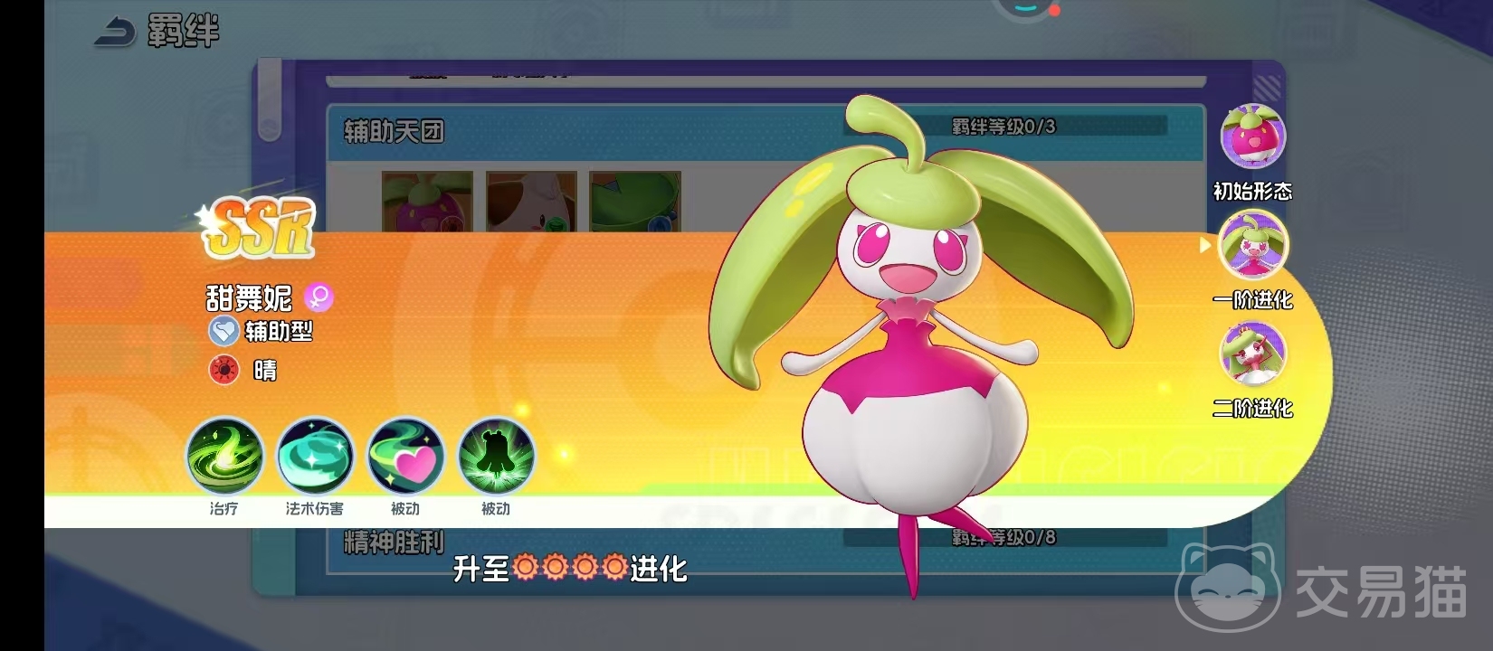 当满足特定条件后,甜竹竹将进化为甜舞妮。此阶段外观显著变化——绿色长发替代原有果壳造型,动作姿态转向动态化表达。技能体系同步升级:新增热带阳光属性攻击技,单次旋转可触发灼烧效果;位移技能附带短时闪避判定,大幅提升生存容错率。此时已具备独立承担前排牵制任务的能力,不再依赖队友掩护,标志着从纯辅助向攻防兼备型角色的实质性转变。
