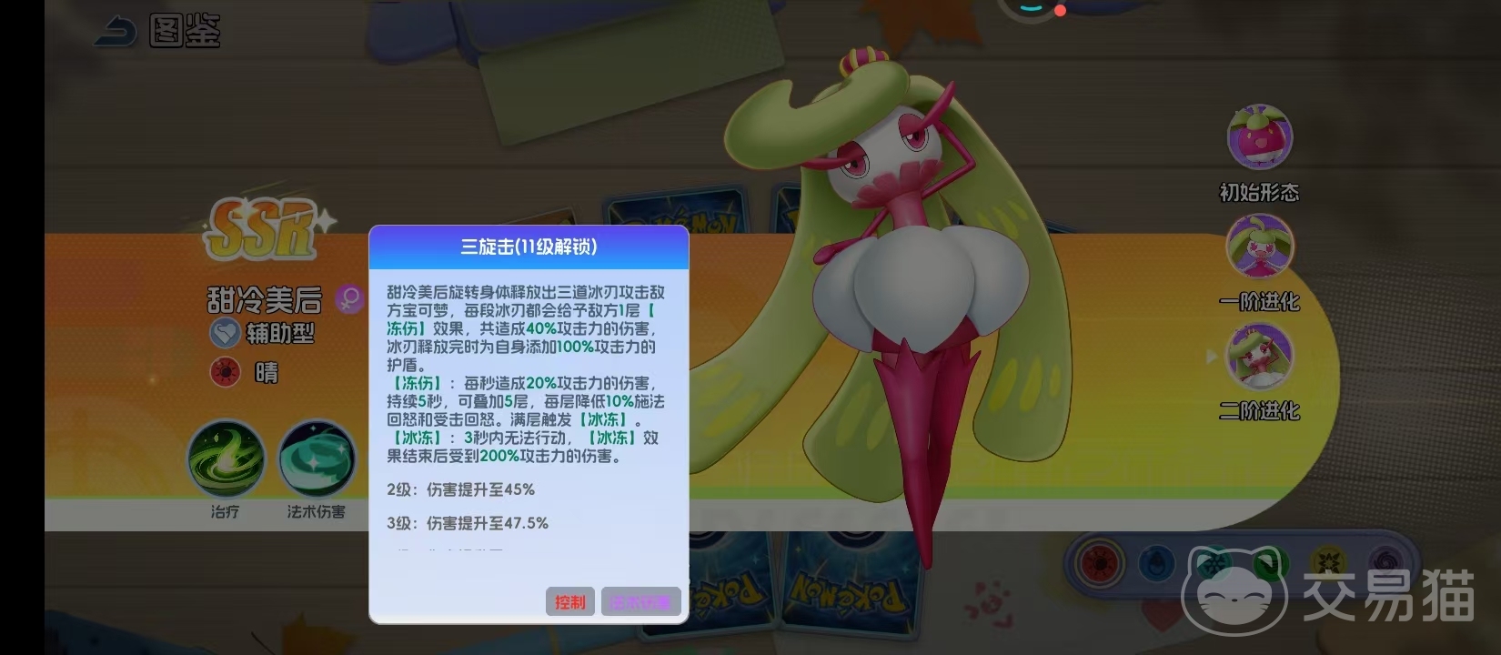 最终形态甜冷美后代表该精灵战力上限。外观设计强化女王意象:垂落如瀑的绿色长发、镶嵌晶石的冠冕造型,配合冰系能量具象化的视觉特效,塑造出兼具威严感与优雅感的终极形象。核心机制围绕“三玄技”展开——连续释放三道冰刃,每道命中目标后叠加冻伤状态(降低目标行动速度并持续造成寒冰伤害);三段技能释放完毕后自动触发寒霜护盾,吸收一定比例的 incoming 伤害。此外,其被动技能可在友方单位生命值低于30%时,自动施加群体治疗与攻击力提升效果,显著增强队伍整体作战韧性。