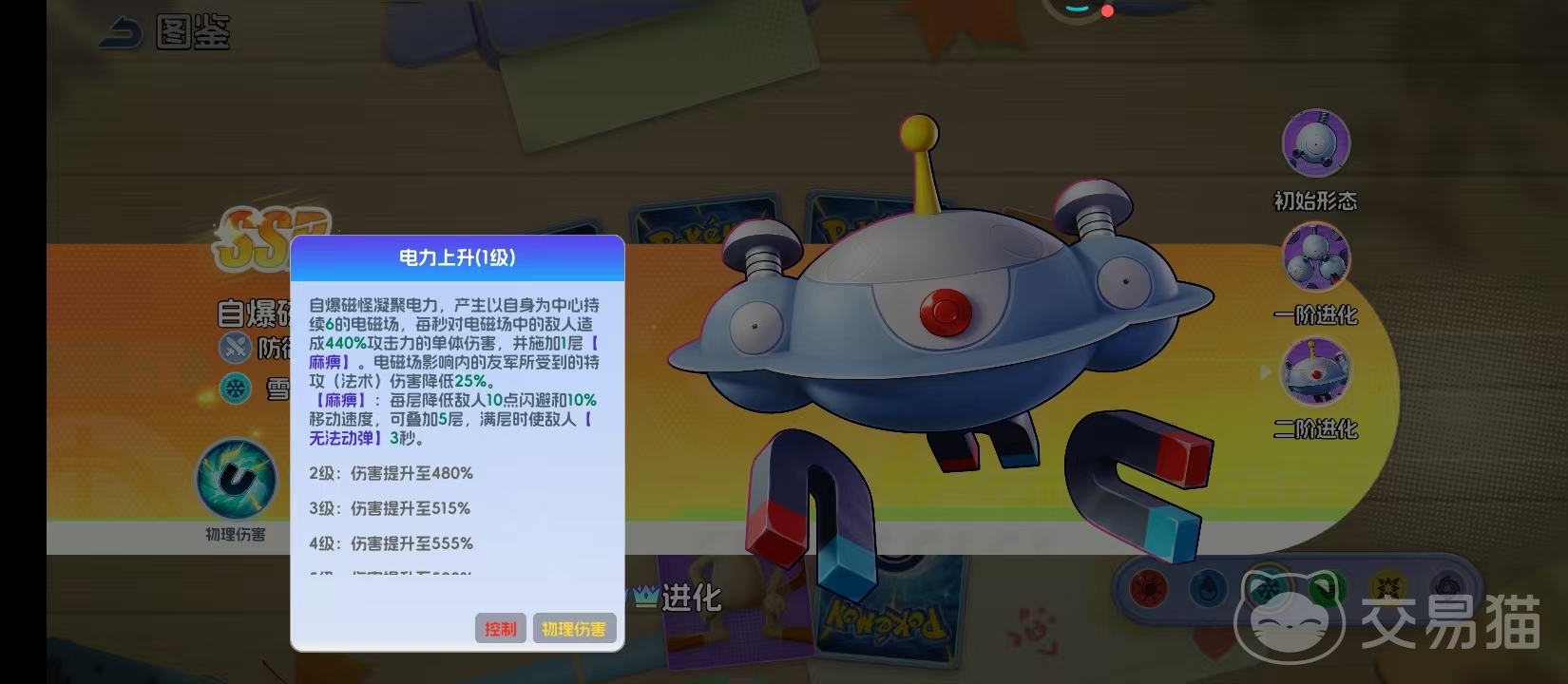 最终形态为自爆磁怪,完成三核融合,中央红色核心稳定搏动,象征能量高度凝聚。核心技能“电力上升”即为其终极进化体现:以自身为中心展开持续6秒的电磁领域,每秒对范围内单个目标造成440%攻击力的伤害,并附加麻痹效果。该技能兼具输出与控场双重效能——除直接伤害外,还可降低目标25%守护属性,且麻痹层数叠加可削弱闪避率;叠满后触发3秒完全禁锢,彻底剥夺行动能力,在关键团战中具有扭转局势的战略价值。