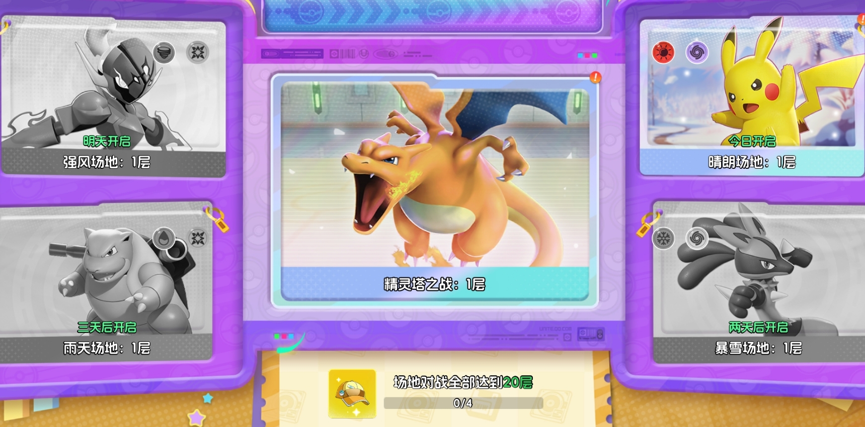 二者核心差异在于出战限制:“精灵塔之战”不限制阵营,所有已拥有的宝可梦均可自由编队;而“场地对决”则依据当日开放的特定环境场地(如晴朗、雨天、沙暴等)设定上阵资格——例如晴朗场地仅允许晴阵营与幻阵营宝可梦出场。该模式每日仅开放一种场地类型,其余场地处于锁定状态,但各场地独立保存通关进度,关闭期间不会清空已达成层数。