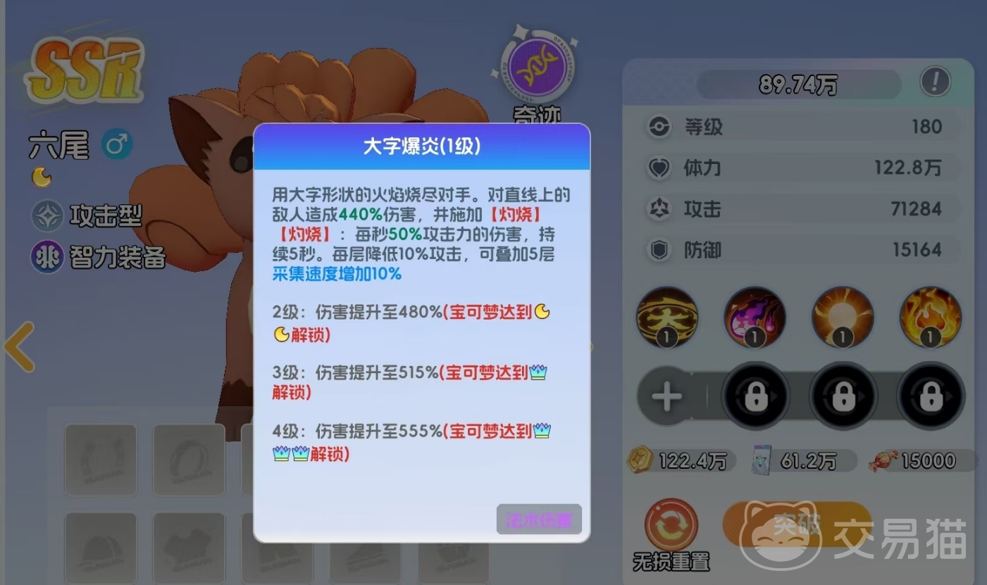六尾进化为九尾的前提,是将其升阶至皇冠4阶。该过程需消耗9只九尾本体材料与33只晴阵营宝可梦作为进阶资源。完成进化后,九尾将继承并强化六尾的核心机制:其大招与41级技能均可对目标施加灼烧状态,每层灼烧造成基于自身攻击力的持续伤害,最多叠加5层;每层还额外降低敌方10%攻击力。配合11级技能附带的睡眠控制效果,九尾在实战中既能稳定打出高额法伤,又能有效干扰敌方节奏,实现输出与控场双重职能。