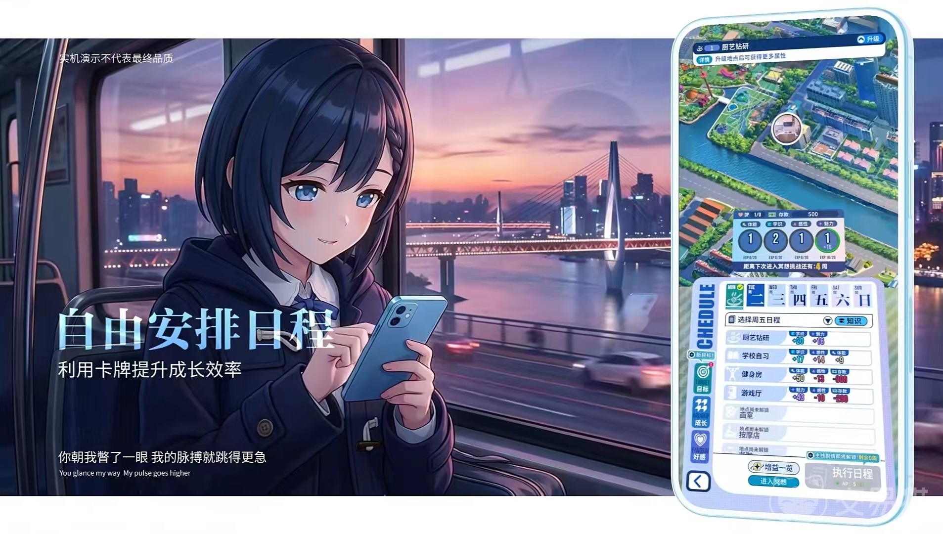 《心动循环》在玩法结构上融合了卡牌策略、Roguelike随机机制与生活模拟三大核心模块。玩家将在校园日常中逐步积累成长资源,并通过脑内卡牌对战形式实现角色能力跃升;四季更迭、三餐作息等真实生活片段均被转化为可叠加的增益效果,例如由角色亲手制作的便当,不仅能触发好感度加成,还可直接提升战斗表现。副本系统采用多世界架构设计,除主线校园场景外,还包含中世纪贵族篇章、古代科举线等跨时空支线,各副本拥有独立世界观、叙事逻辑与任务体系,确保剧情体验不重复、不套路。