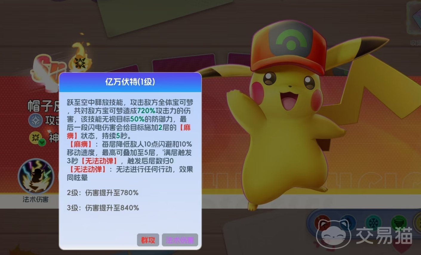 控制维度上,帽子皮卡丘具备稳定的麻痹叠加能力。其主动技能(含大招、11级技能及41级技能)均附带麻痹效果,每层持续1回合;当敌方累计承受5层麻痹时,将立即陷入“瘫痪”状态——该状态下目标完全无法行动,既不能普攻、释放技能,也无法位移或使用道具,仅能被动承伤。配合其被动提供的伤害规避效果及增益加成,整体生存韧性显著增强,有效规避被集火秒杀的风险。