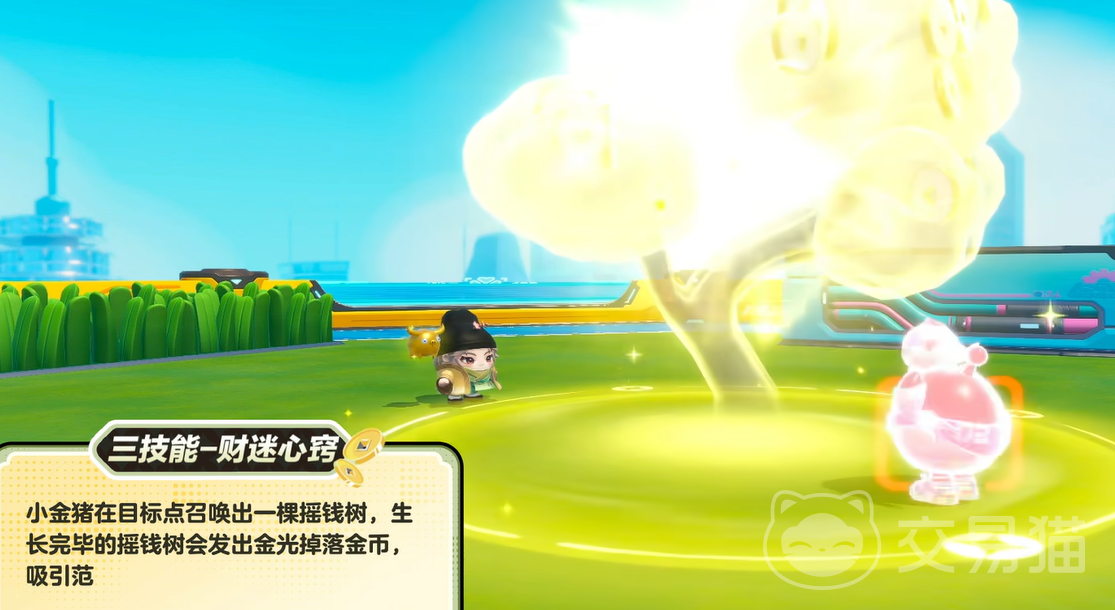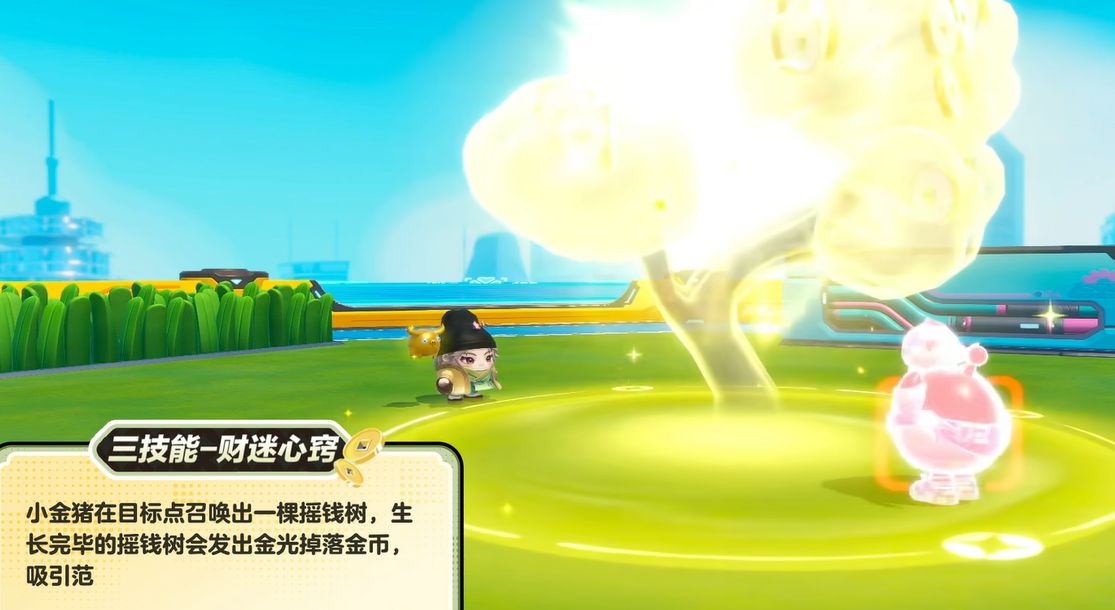 大招财迷心窍可在指定圆形区域召唤摇钱树,持续存在4秒。树体生成后立即对范围内所有敌方单位施加强制位移效果,使其以固定速率向树干中心靠拢,同时每秒造成中等伤害。该控制具有不可驱散特性,且范围稳定可控,适用于据点防守、狭窄地形封路或配合AOE输出技能完成集火击杀。