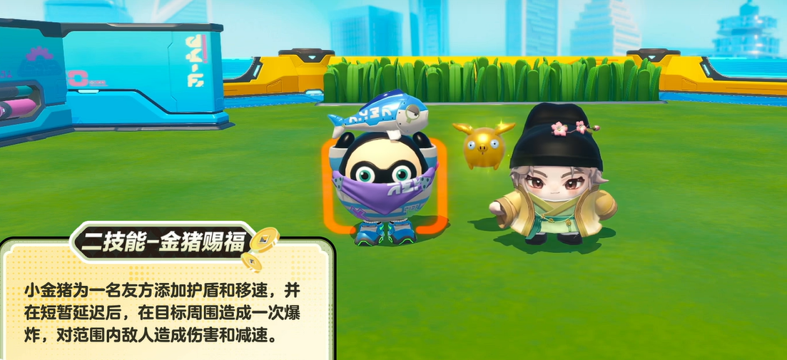 金猪赐福(2技能)为单体队友施加可吸收一定量伤害的护盾,并同步提升其移动速度25%,持续2.5秒。小金猪抵达目标后存在短暂延迟(约0.8秒),随后引发二次爆炸,对半径2米内敌人造成伤害并附加1.5秒减速。此机制实现“保护—反击”双效联动,是解围、反打及配合突进型队友的关键衔接技能。