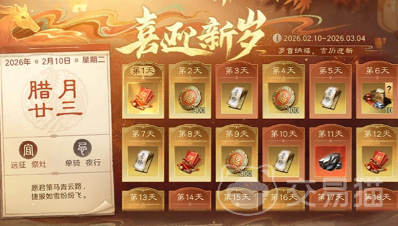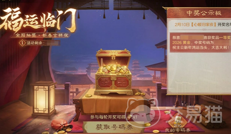 【福运临门】为概率型资源获取玩法,活动期为2月10日至3月3日。所需抽奖卷可通过“百戏游园”与“元夕灯谜”两大日常模块稳定获取。开奖节点设于2月17日、2月21日、2月24日及3月3日,单次中奖最高可得2026黄金,助力玩家加速资源积累。