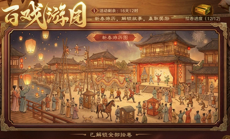 【春节白戏】以沉浸式叙事为核心,开放时间为2月10日至2月24日。每日0点自动解锁一段专属剧情,观看完成后可点亮游历拼图中对应板块,单次点亮即获福禄钱与全服抽奖卷;完成整张拼图后,还将解锁额外限定奖励,实现剧情推进与资源获取双重收益。
