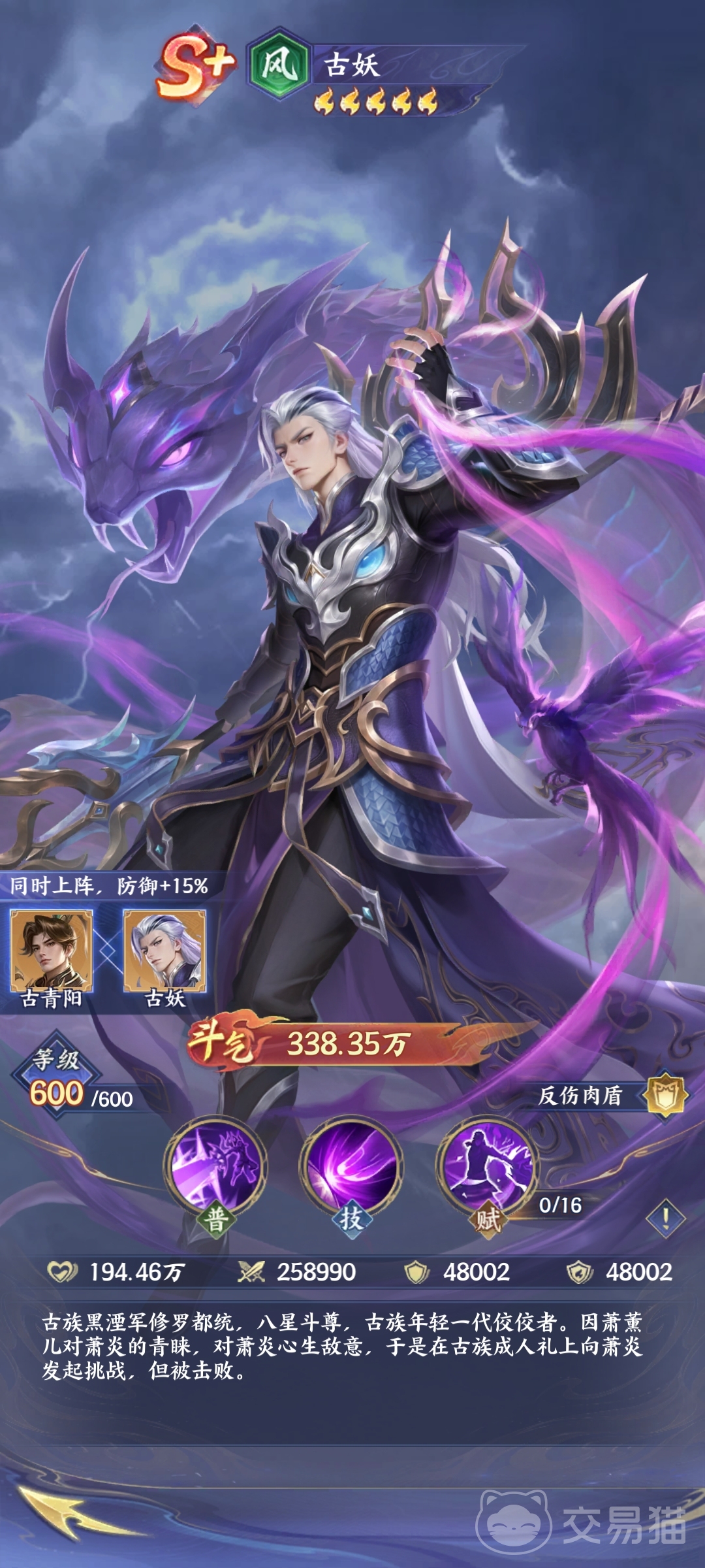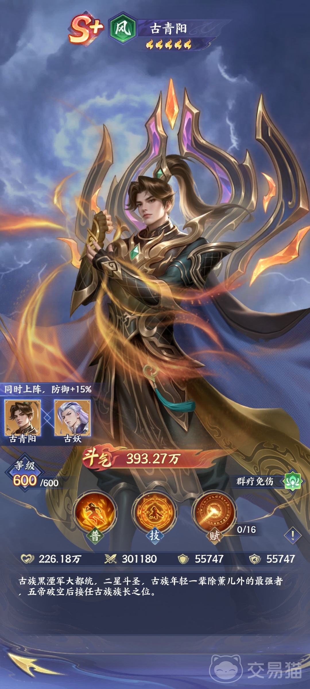 古青阳(风·群疗免伤):稀缺型团队守护者,技能设计全面覆盖治疗、护盾、解控与低血量应急防护。普攻“古族守护”为队友施加护盾,技能提供群体治疗并驱散控制效果;天赋可在队友生命低于50%时自动触发高额免伤护盾。与古妖激活羁绊后,额外提升15点防御属性,使其在承担治疗职责的同时具备可观承伤能力,特别适配高控场、高爆发环境下的容错构建。