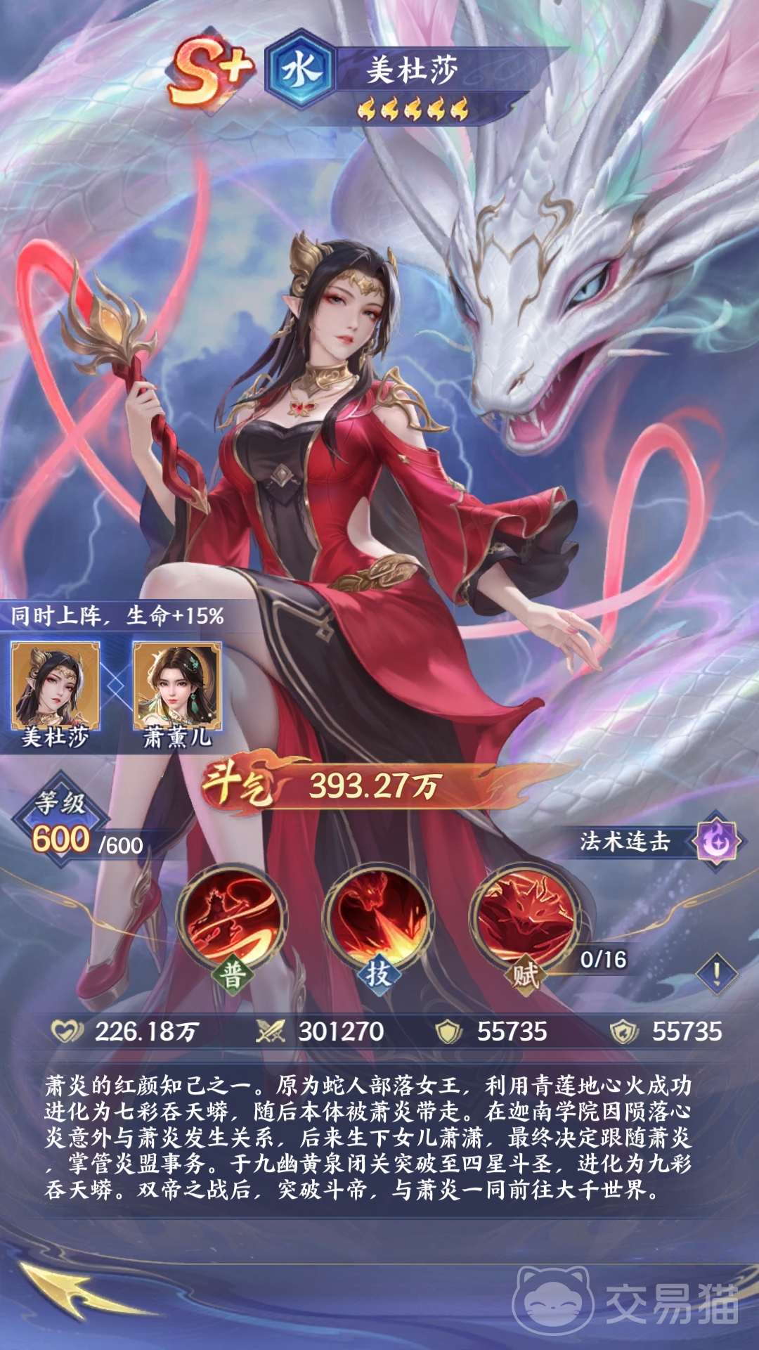 萧炎(火·物理高伤):原著主角还原度极高的单体物理爆发核心。普攻造成高额单体物理伤害,大招“陨落心炎”具备前排破甲特性,可显著削弱敌方坦克防御。天赋支持战斗中持续提升攻击力,越战越强特性明显。与美杜莎协同作战时,能最大化破甲收益与法术联动空间,是物理速攻体系中无可替代的主输出位。