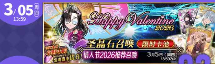 角色获取方面,情人节版本更新后将实装新从者小野小町;同期开放常驻五星女性从者及剧情限定五星女性从者双周替卡池(具体名单以正式公告为准)。新春活动期间,国服独家推出“第二部通关应援福袋(第三期)”,该机制参考美服2025年11月感恩节活动设计,目前日服尚未实装同类内容。