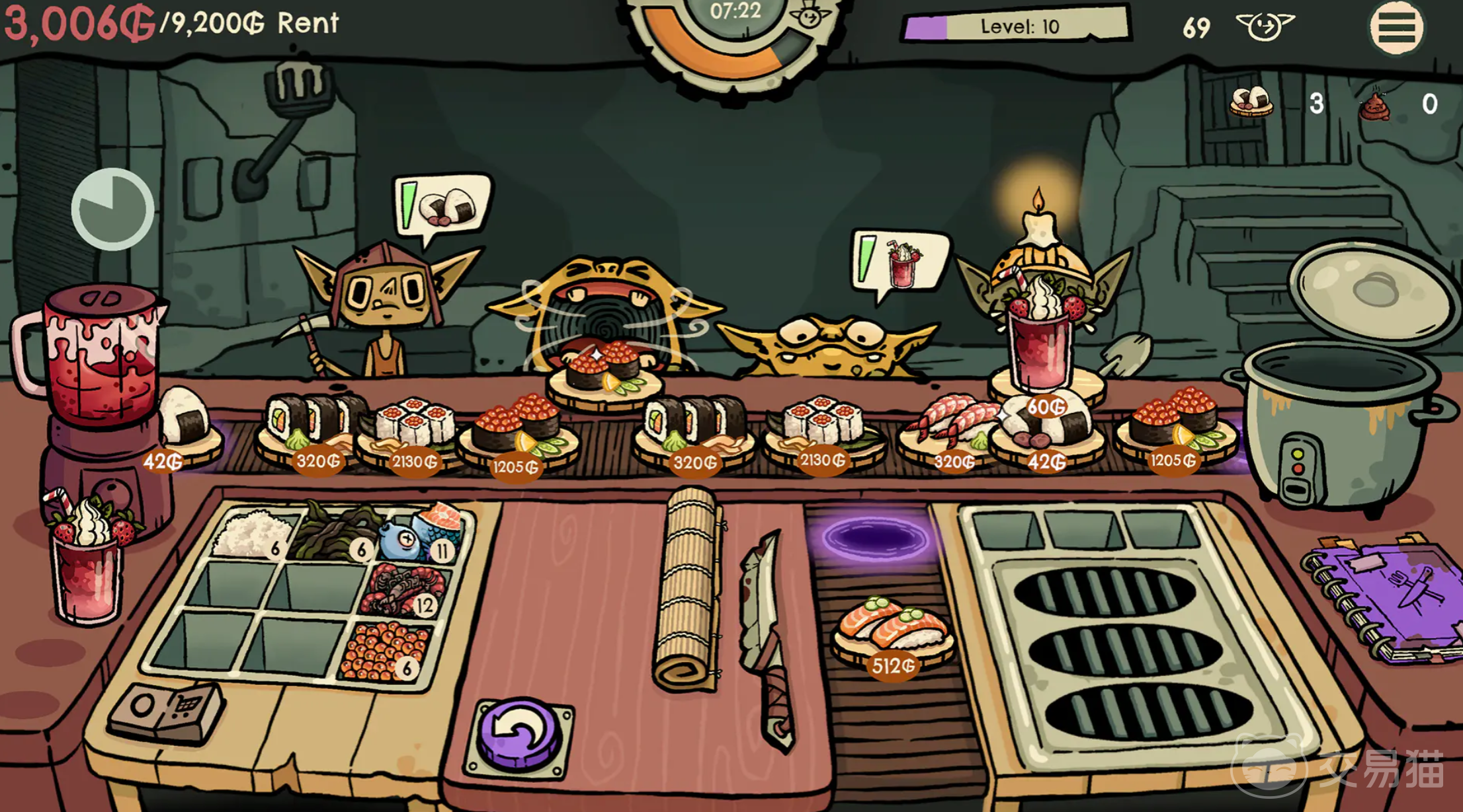 作为一款主打创意经营与节奏操作的休闲模拟游戏,《哥布林寿司》并未预设固定菜谱或稳定客流。玩家需在资源有限的洞穴环境中自主研发配方、应对口味各异的顾客需求,并通过精准点击与快速反应完成切鱼、捏饭、摆盘等全流程操作,以提升出餐效率与店铺口碑。