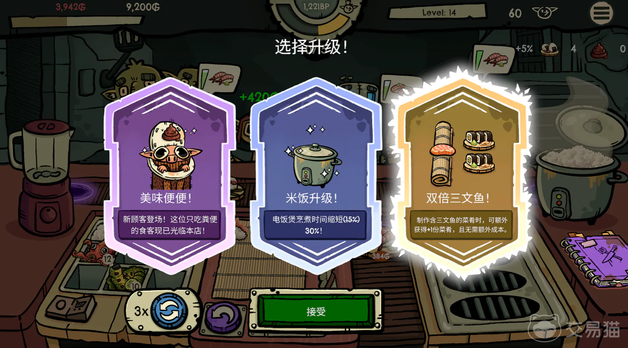 游戏内经济系统强调策略性运营:金币获取直接影响食材采购、工具升级与租金缴纳进度。房东催租压力真实存在,促使玩家在成本控制、订单优先级与创新试错之间持续权衡。随着进程推进,玩家将逐步解锁稀有奇幻食材,例如荧光海藻、岩浆鳗鱼、月光米等,自由组合后可能触发特殊效果或隐藏料理成就。