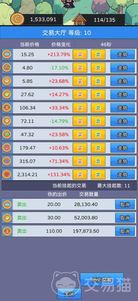游戏中不存在价格黑箱,所有交易数据均公开可查。玩家可通过行情面板实时监控各币种涨跌趋势,结合短周期波动规律执行低吸高抛操作;同时,系统支持挂机收益机制,满足不同节奏偏好——既适配高频交易型用户,也兼顾休闲经营需求。值得注意的是,部分货币存在涨停限制,该机制由算法自动触发,与单次交易量、历史成交密度及随机事件权重直接关联。