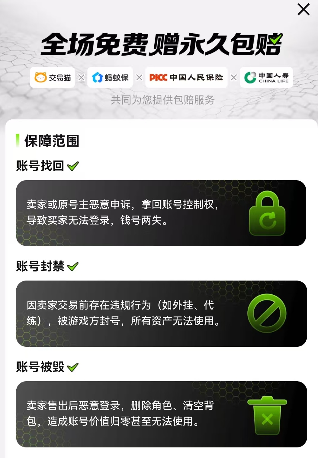 安全方面现在已经做到了成品号全覆盖永久包赔,这次直接赠送的服务,只要账号被找回或者是封号毁号等,都能获得一定比例的赔付。有些是属于全额包赔,能够进行全额赔付。在账号出售的时候,可直接进行官方验号,这样商品会直接提供验号报告,上架非常简单。凡是带验号报告的商品都是值得信赖的,这样的号在购买之后就无需再进行检验,发货速度会更快。对于交易双方来说都是非常有保障的服务,因为这样就不用担心验号泄露自己的隐私,也不用担心出现虚假宣传的问题。