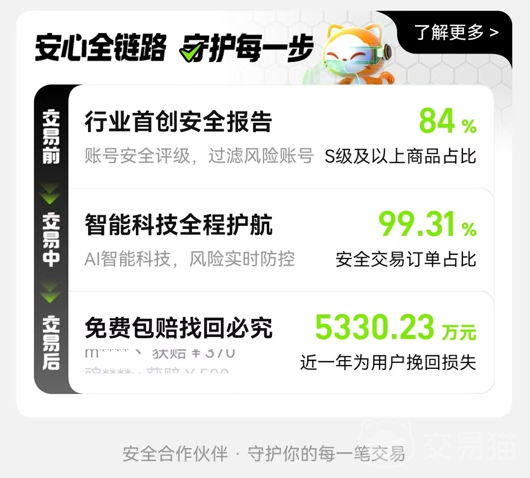 有了便捷性之后,接下来还有安全性方面保障。首先是采用了严格实名制认证和芝麻信用绑定模式,买卖双方都实名,从源头上防止欺诈。在资金方面是由平台第三方托管,只有当买家拿到账号后,确实确定没有问题,才会直接打给卖家。拥有专业团队核验账号数据,如果感觉不符合可以随时取消交易。最后是交易猫对所有成品号都覆盖了永久包赔,这样不用担心账号被找回和出现异常封禁的情况。