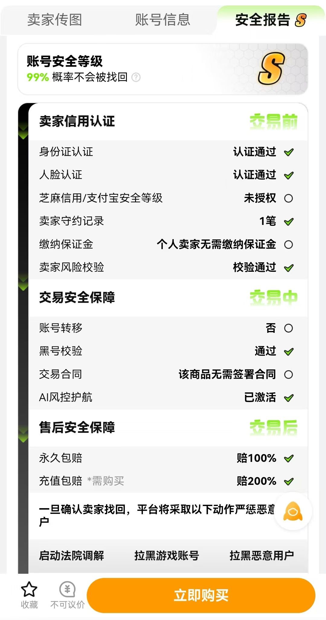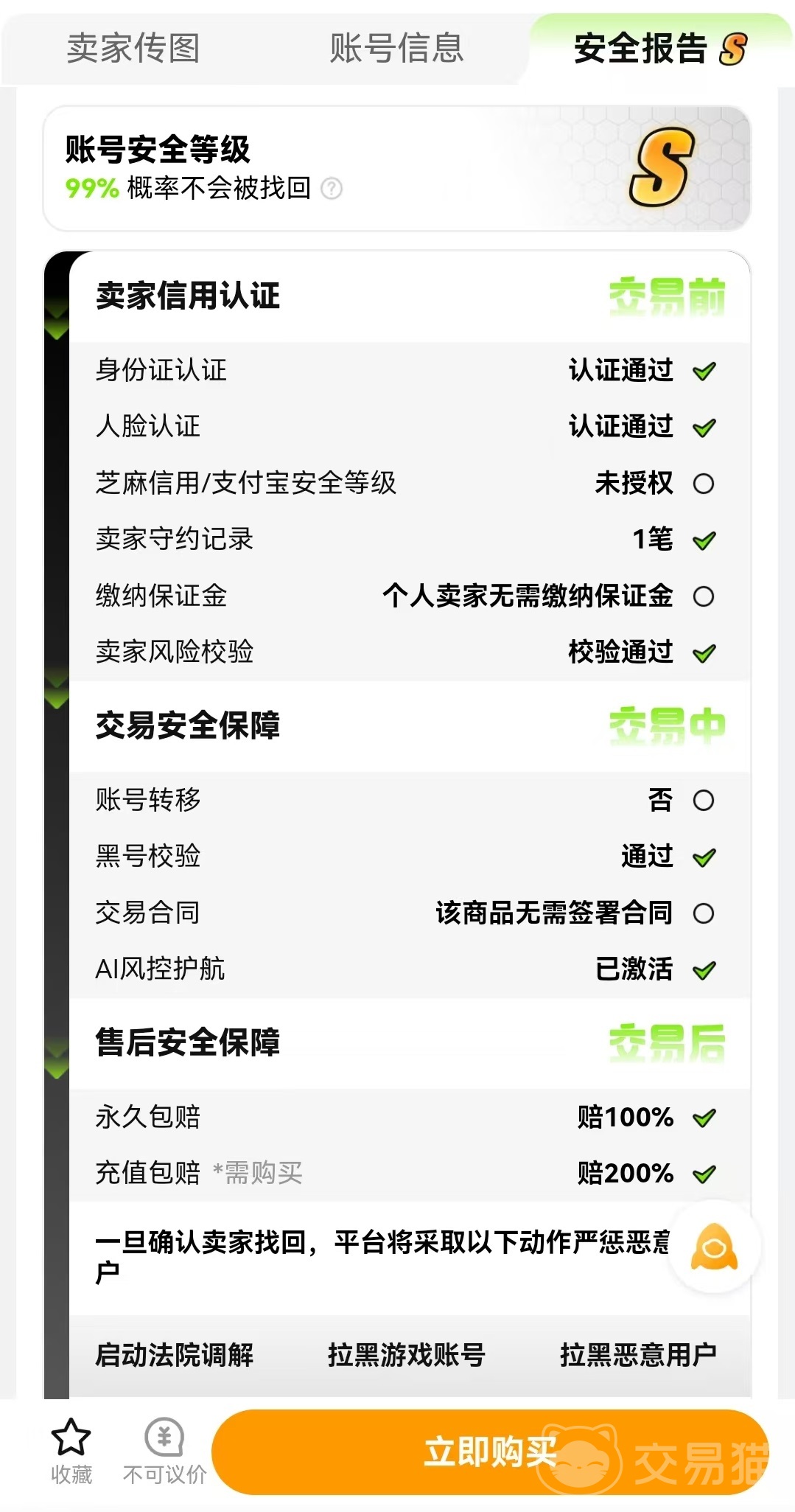 交易猫安全方面也有很多保障,对于每个出售者都进行严格认证,并且根据多项情况综合进行评分,每个账号都会有相应的安全报告。这样就是为了让诚实守信的商家能够最更快出售出去,买家也可以挑选那些安全良好的用户进行交易,这样就能净化环境,获得更好的体验。