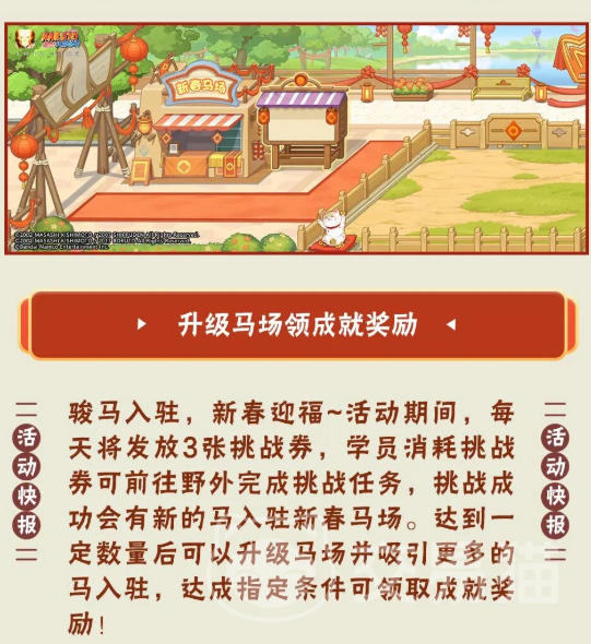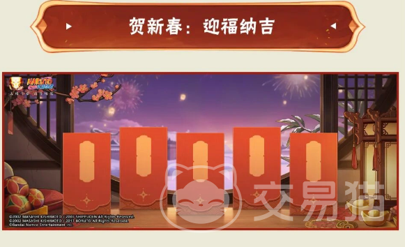 「忍者拜年」同步上线:进入新春主城场景后,随机触发NPC忍者贺岁互动,完成对话即可领取新春礼盒,内含经验药水、装备强化石、招募令等成长型道具,累计领取满额可激活额外进度奖励。