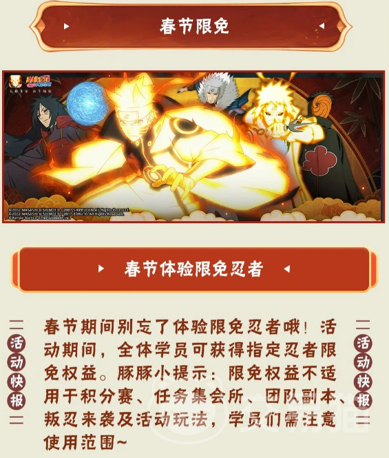 「新春限免忍者」活动再度回归:活动期间,忍者图鉴中将标注当期免费体验角色,包含宇智波鼬、春野樱等高人气S级忍者,所有玩家均可无门槛试用,助力新春副本攻坚与竞技场突破。