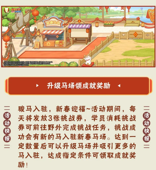 「新春马场」为全新养成模块:活动期内,官方每日发放3张野外挑战券,消耗后可前往指定地图完成限时狩猎任务;成功捕获坐骑后,该马匹将入驻马场;马场等级随入驻总数提升,每升一级开放新马种及额外资源产出加成;达成各阶段目标后可领取坐骑皮肤与属性增幅符文。