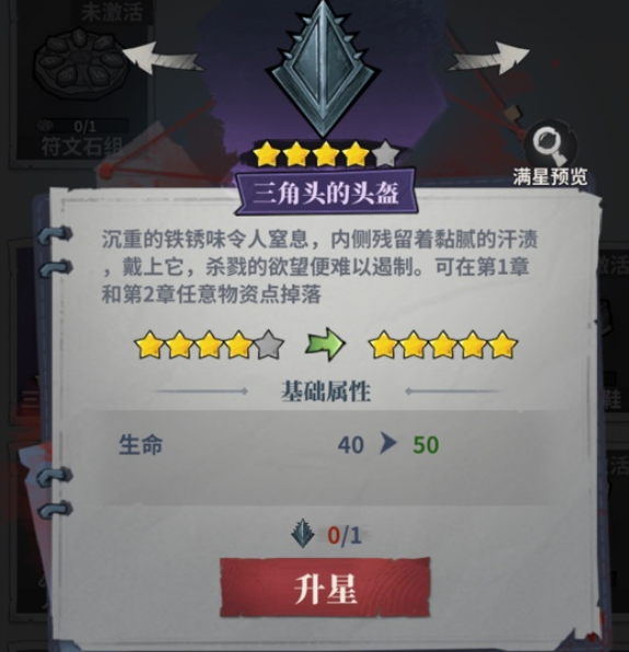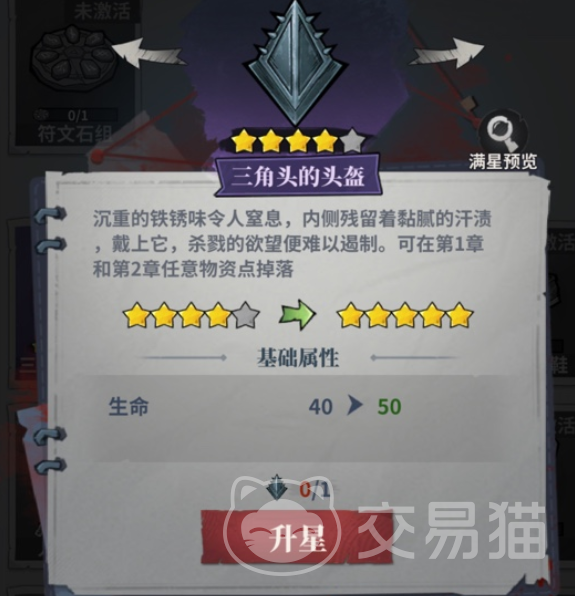 通关后有较高几率获得稀有藏品【三角头的头盔】,其核心效果为提升角色基础生命值上限。该藏品支持星级升级,建议通过反复通关本关积累材料,实现长期战力成长。