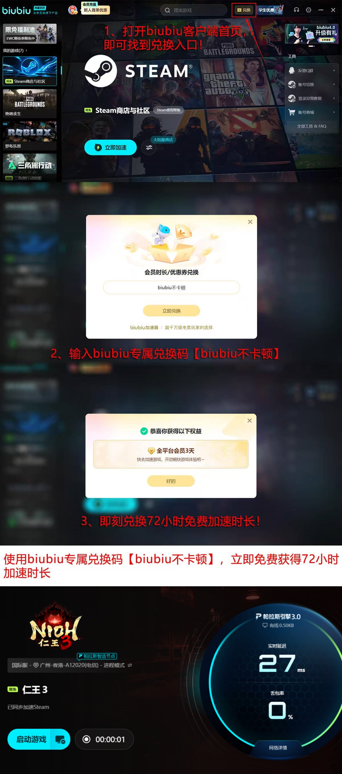 新注册用户首次登录即可领取24小时全游戏免费加速权益。若在激活界面输入专属兑换码【biubiu不卡顿】,还可额外获得连续72小时的加速服务时长,无需绑定支付方式即可立即启用。
