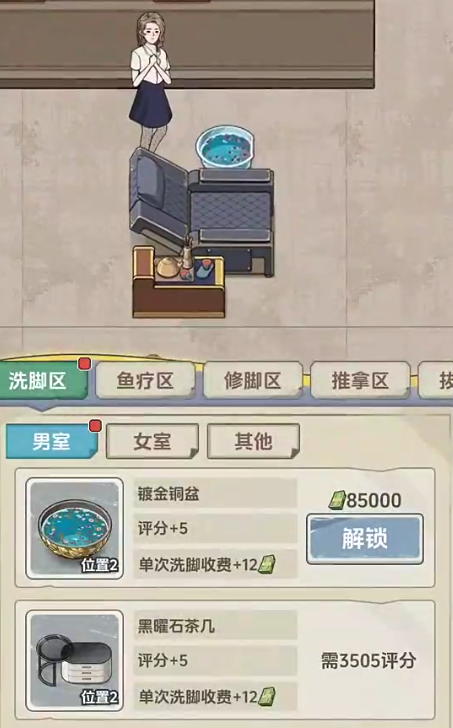 游戏深度还原线下足疗门店运营模型:需平衡顾客满意度、员工工作效率与资金周转节奏;通过处理突发状况(如客户投诉、设备故障、卫生检查)积累口碑与营收;逐步拓展店铺面积、升级洗脚池、按摩床等硬件设施;并按阶段解锁修脚、鱼疗、推拿按摩等增值服务模块。