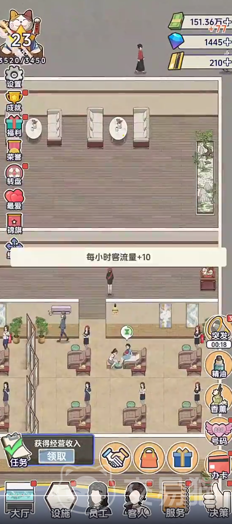 员工系统包含能力图谱、技能树与幸运号码机制:每位员工拥有基础属性(亲和力、手法熟练度、响应速度),可通过培训课程定向强化;分配特定数字编号可激活临时加成效果,考验玩家在排班调度与人力配置中的策略决策能力。